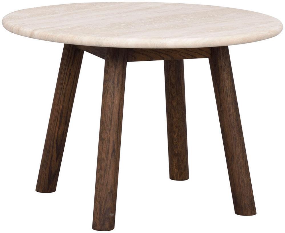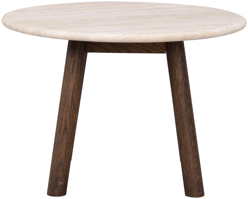 Lyxiga Taransay soffbord Ø60 cm har en exklusiv stenskiva av sandfärgad travertin från Italien och massiva ben av brunlackad FSC-certifierad ek. Travertin är en kalkstenstyp med fina skiftningar som ger soffbordet en naturlig skönhet och med tiden unik patina - där nya detaljer i bordskivan kan upptäckas varje dag.