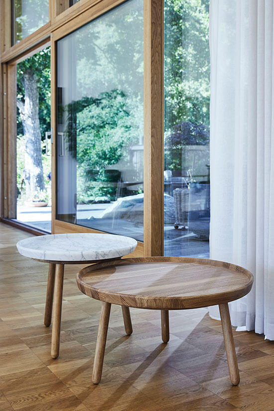 Tureen kan användas som satsbord tillsammans eller vart och ett för sig som sidobord, soffbord, avlastningsbord eller loungebord. Bordsbenen tillverkas i massiv ek, med en ytbehandling av naturell olja eller vitolja, alternativt anpassningsbar variant med valfri kulör och lack.
