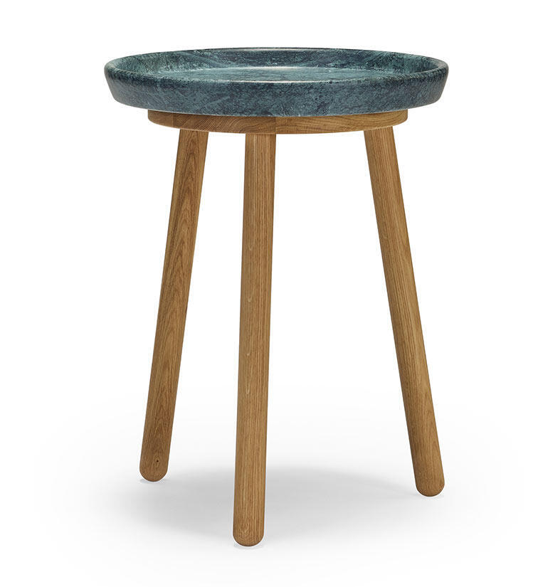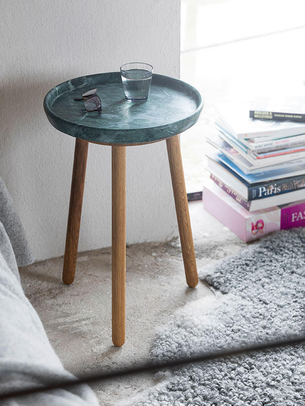 Den här artikeln har massiva ben av ek och en toppskiva av grön marmor, diameter 38 cm. Välj på bordshöjd 43, 50 och 57 cm.