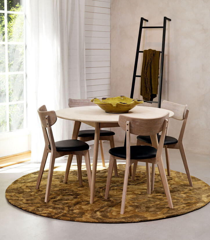 I matgruppen ingår bordet Yumi runt 115 cm och fyra stycken Ami stolar i valfri färg.