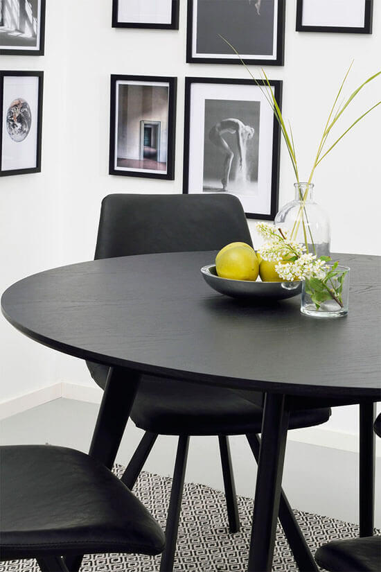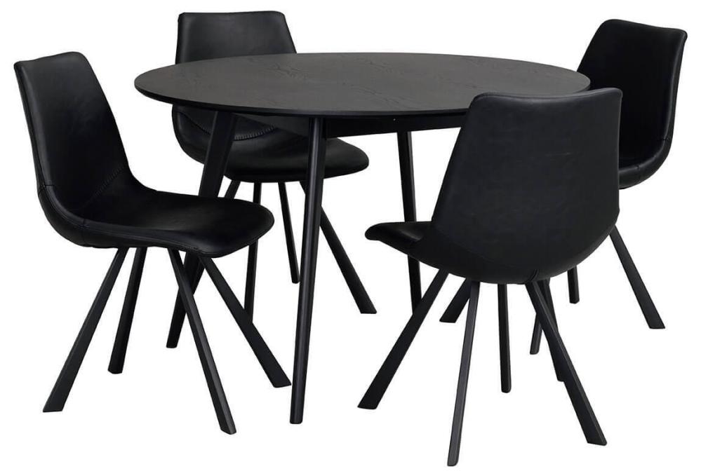 Yumi matbord i skandinavisk design med lätt utställda ben här tillsammans med fyra stycken Auburn stolar. Runt bord i högkvalitativ svartlackad MDF och ben och sarg i gummiträ.