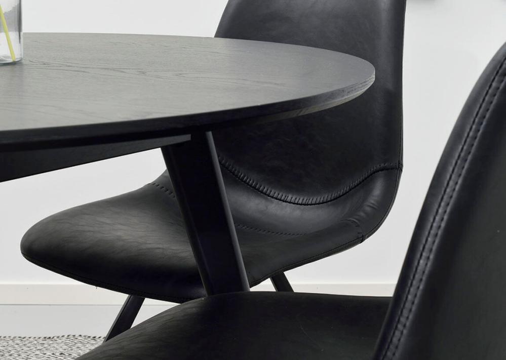 Auburn är en helklädd stol med en trendigt skålad sits i svart eller brunt konstläder med dekorsömmar. Likt bordet har även stolarna lätt utställda ben.
