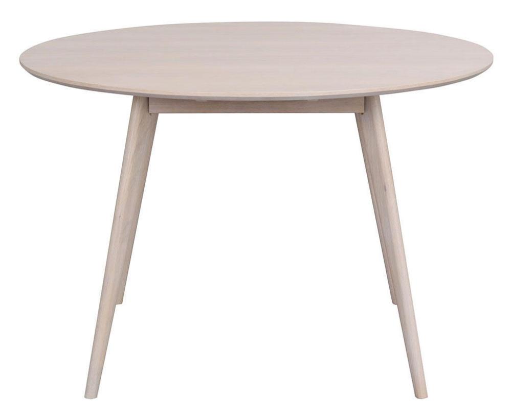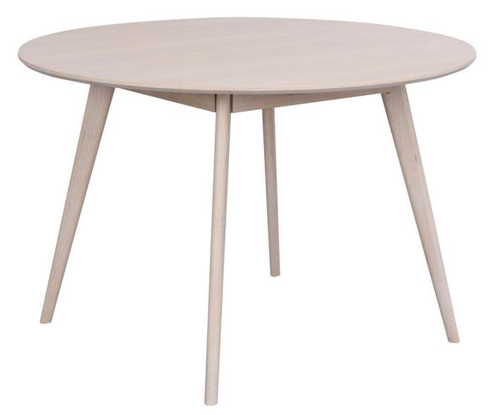 Yumi matbord i skandinavisk design med lätt utställda ben här tillsammans med fyra stycken Auburn stolar. Runt bord i högkvalitativ vitpigmenterad ekfanér och ben och sarg i massiv ek.