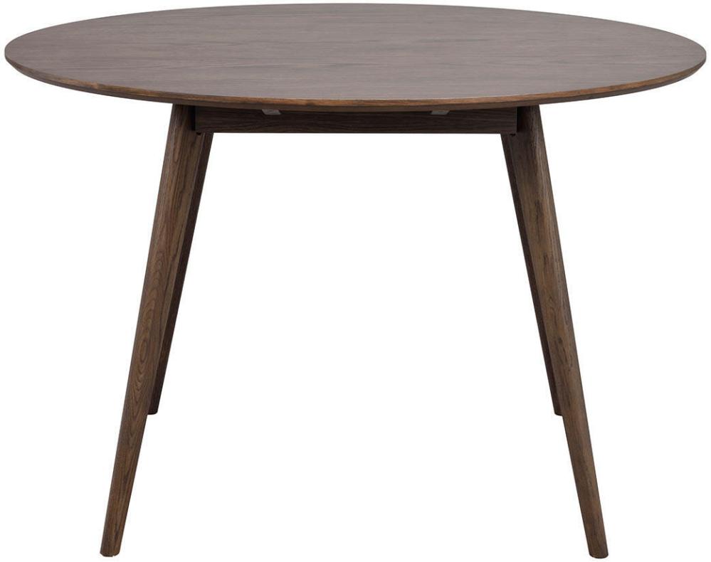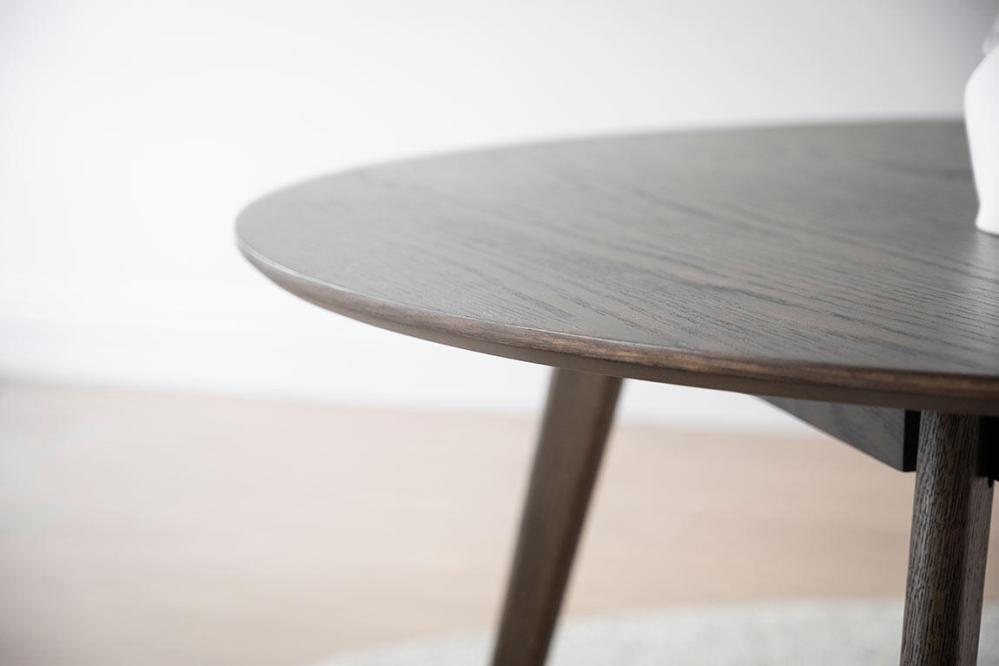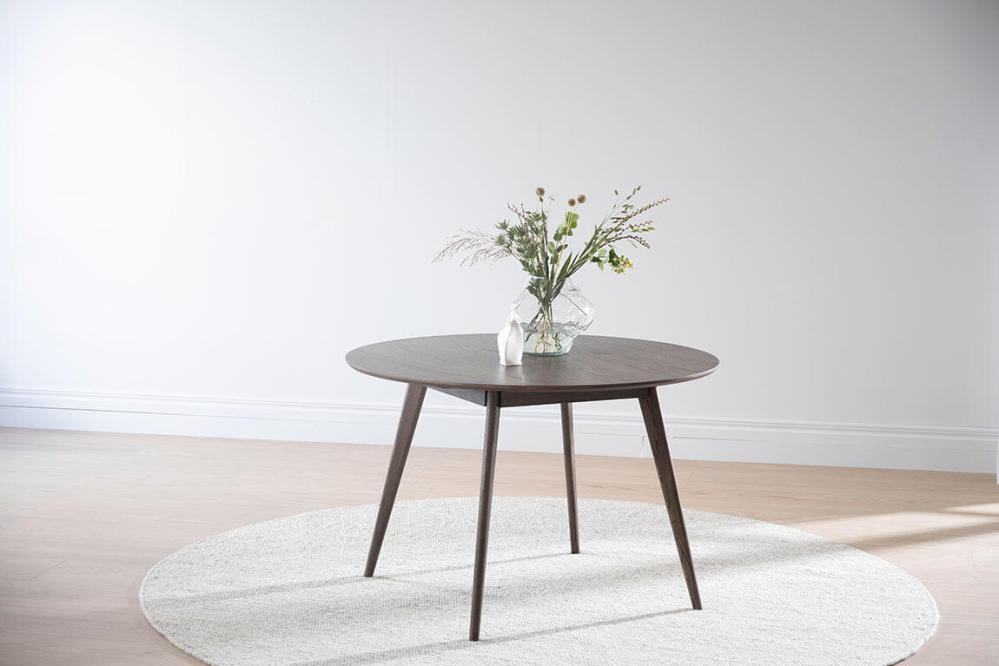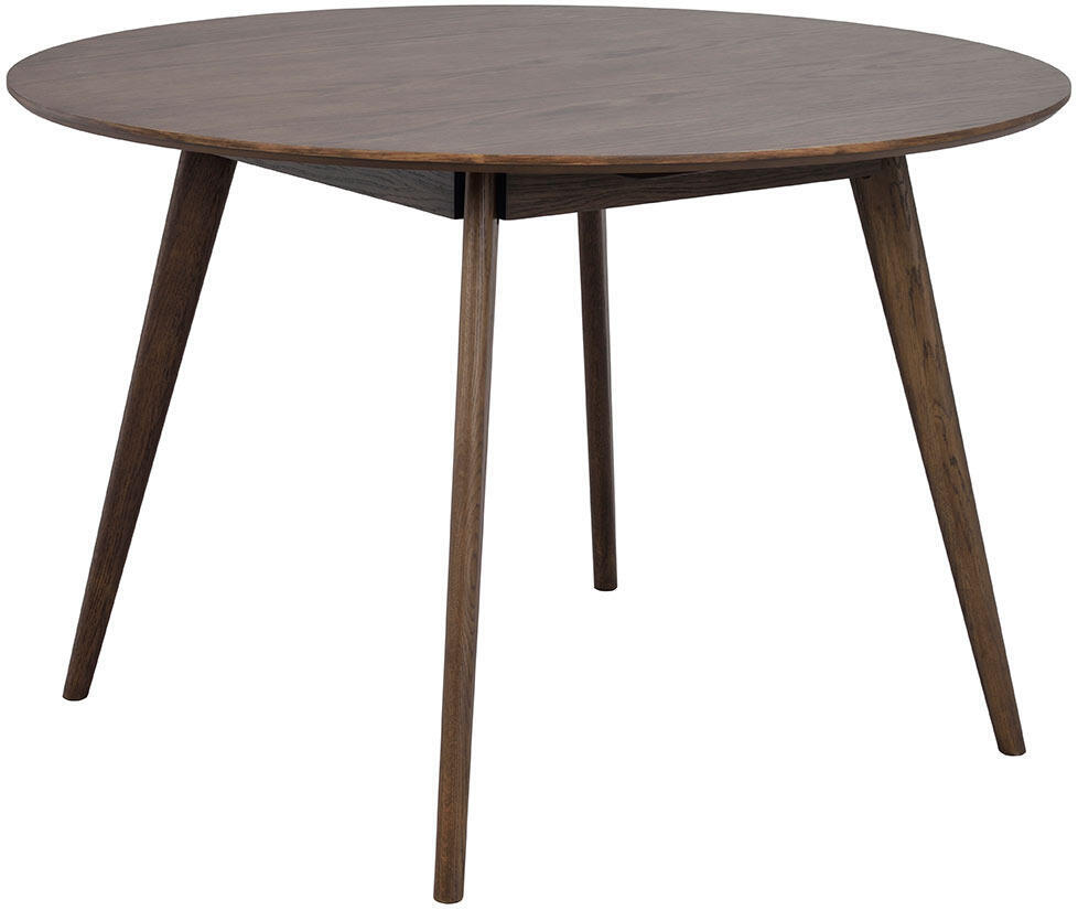 Yumi matbord i skandinavisk design med lätt utställda ben tillsammans med fyra bekväma stolar. Runt bord i högkvalitativ brunlackad ekfanér och ben samt sarg i massiv ek.