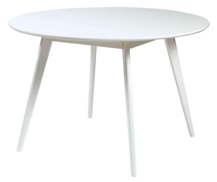 Yumi matbord i skandinavisk design med lätt utställda ben tillsammans med fyra bekväma stolar. Runt bord i högkvalitativ vitlackad MDF och ben och sarg i gummiträ.
