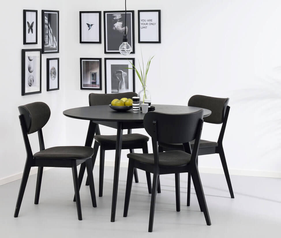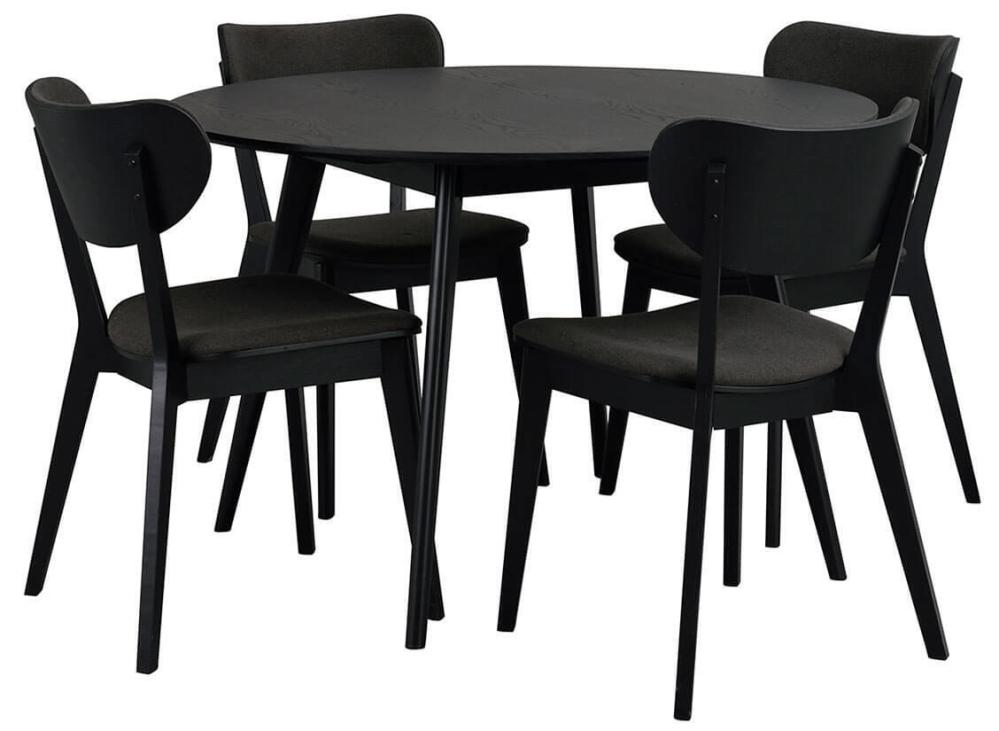 Yumi matbord i skandinavisk design med lätt utställda ben och fyra stycken moderna stolar. Runt bord i högkvalitativ svartlackad MDF och ben och sarg i gummiträ.