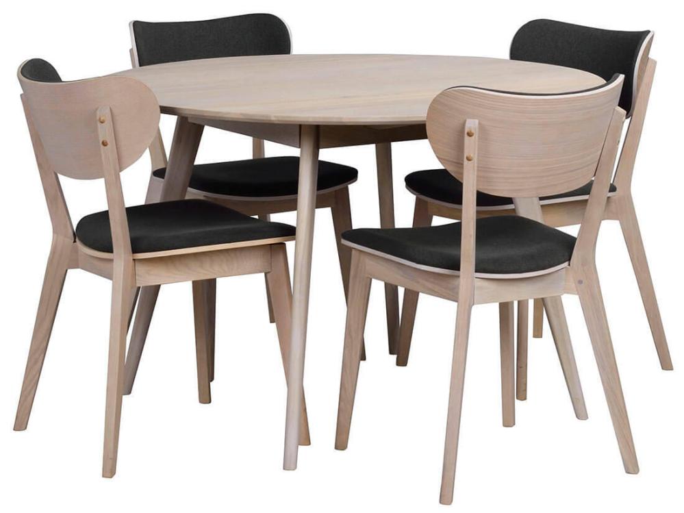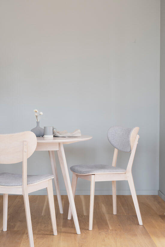 Yumi matbord i skandinavisk design med lätt utställda ben och fyra stycken moderna stolar. Runt bord i högkvalitativ vitpigmenterad ekfanér och ben och sarg i massiv ek.