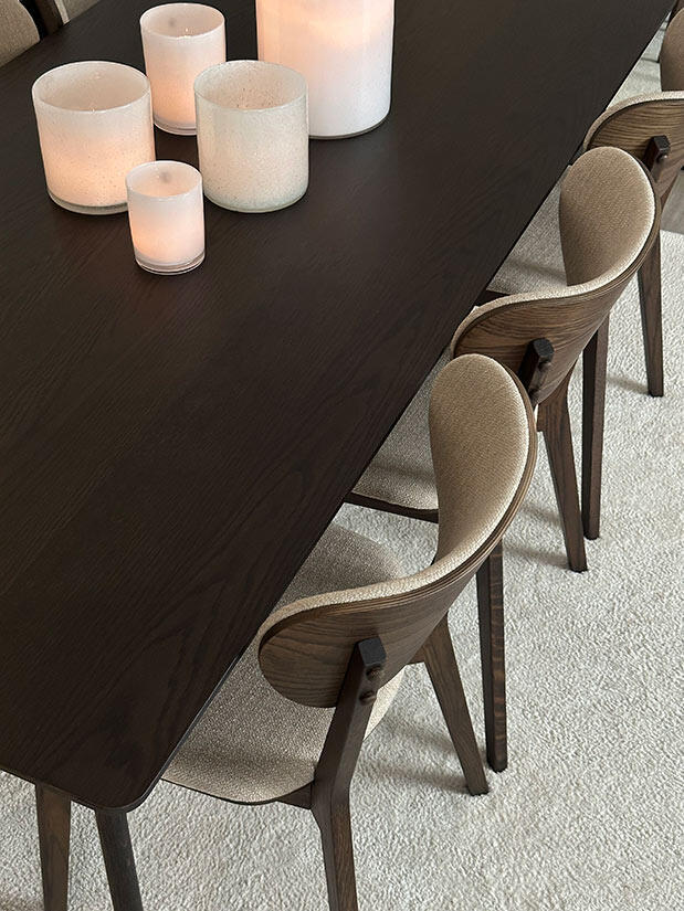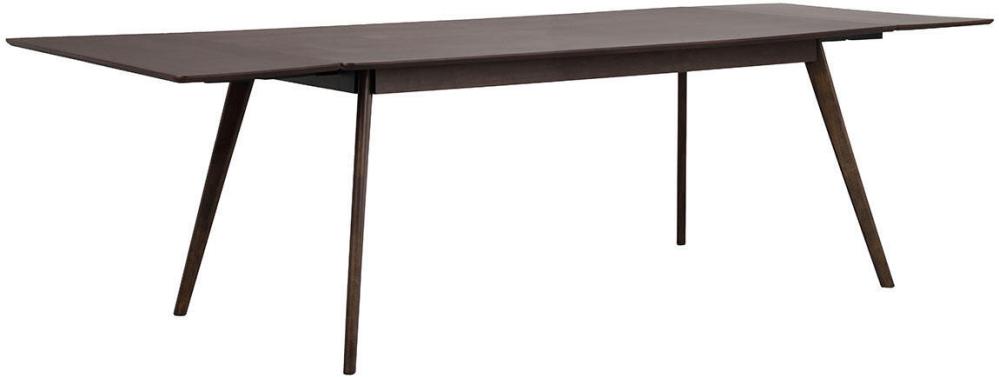 Yumi matbord i skandinavisk design med lätt utställda ben och sex stycken bekväma stolar. Bordsskivan är i högkvalitativ brunlackad ekfanér och ben och sarg i massiv ek. Kan kompletteras med upp till två tilläggsskivor. Maxlängd 280 cm.