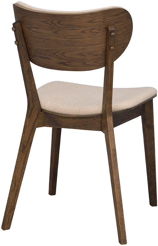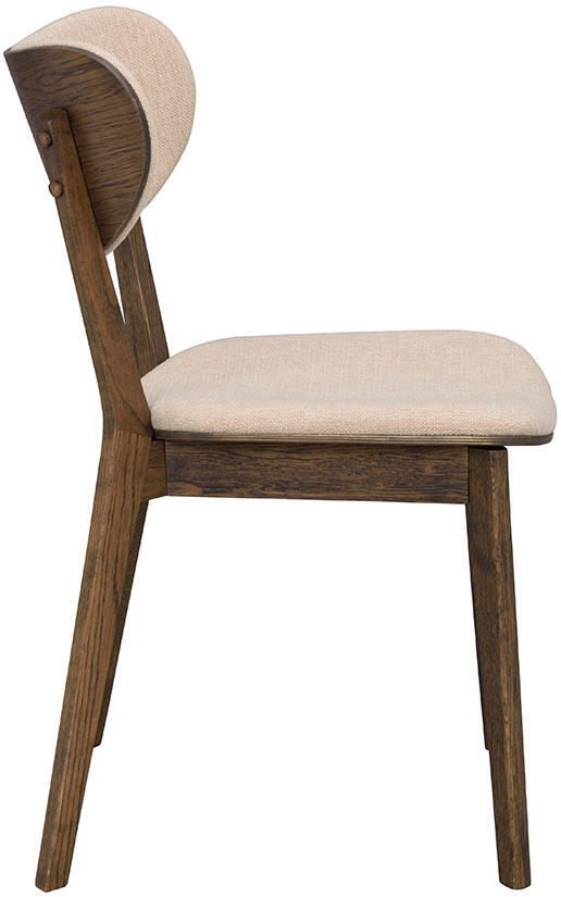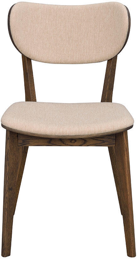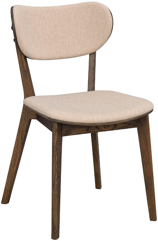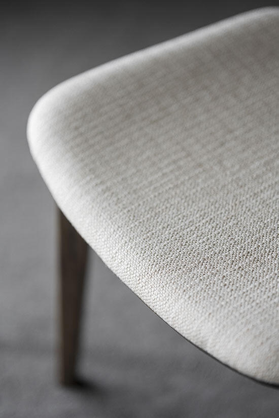 Stol: Massiv ek i ben och stomme. Böjd plywood i sits och ryggbricka, klädd med polyeter och 100% polyester tyg