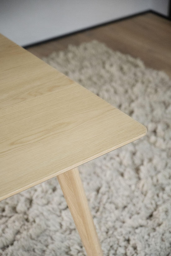 Topp i MDF med ekfaner, ben i massiv ek. Lackad yta.