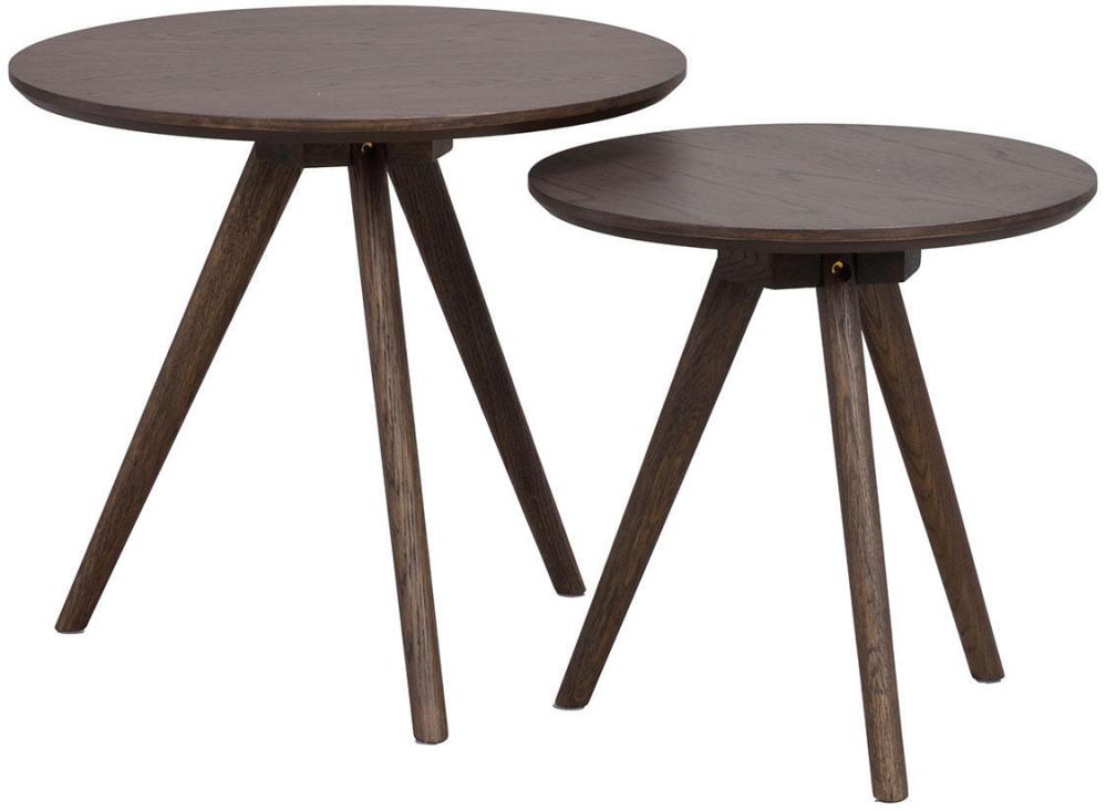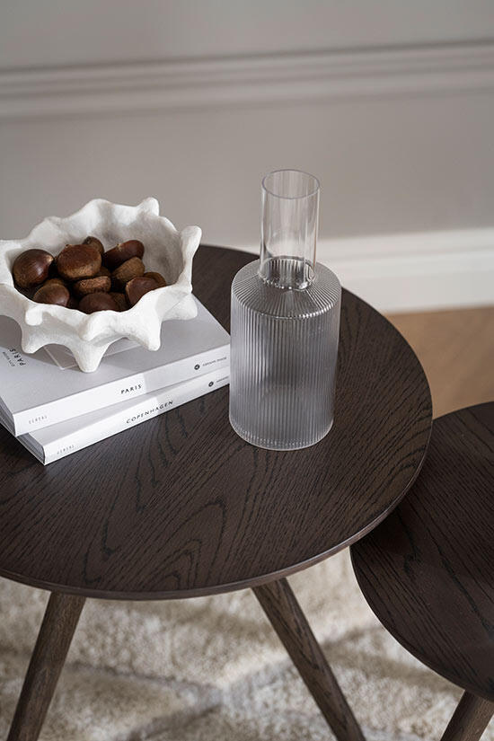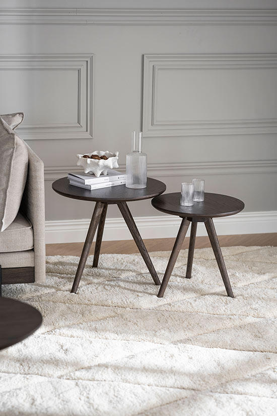Yumi satsbord i skandinavisk design med lätt utställda ben. Två runda mindre soffbord med bordsskiva i högkvalitativ brunlackad ekfanér och ben och sarg i massiv ek.