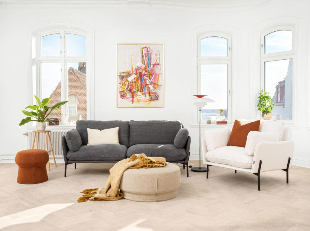 Aldon finns som 3-sits och 2,5-sits med nackstöd som tillval samt fåtölj och pall.