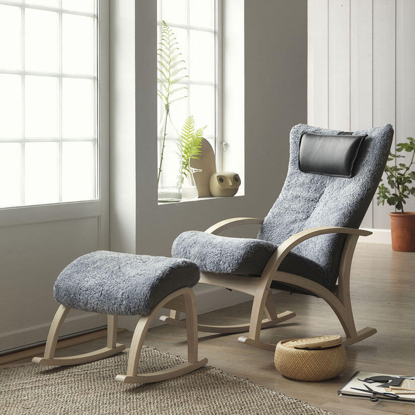 Vid val av fårskinn: Fårskinn på insidan av ryggen och på översidan av sittkudden, matchande tyg Verita på baksidan av ryggen och på sidorna av sittkudden samt med nackkudde i läder Classic. Om du vill bestämma tyg på baksida/sidor och nackkudde så ange det vid beställning i kassan, nackkudden går att välja i valfritt Verita tyg eller Classic läder.