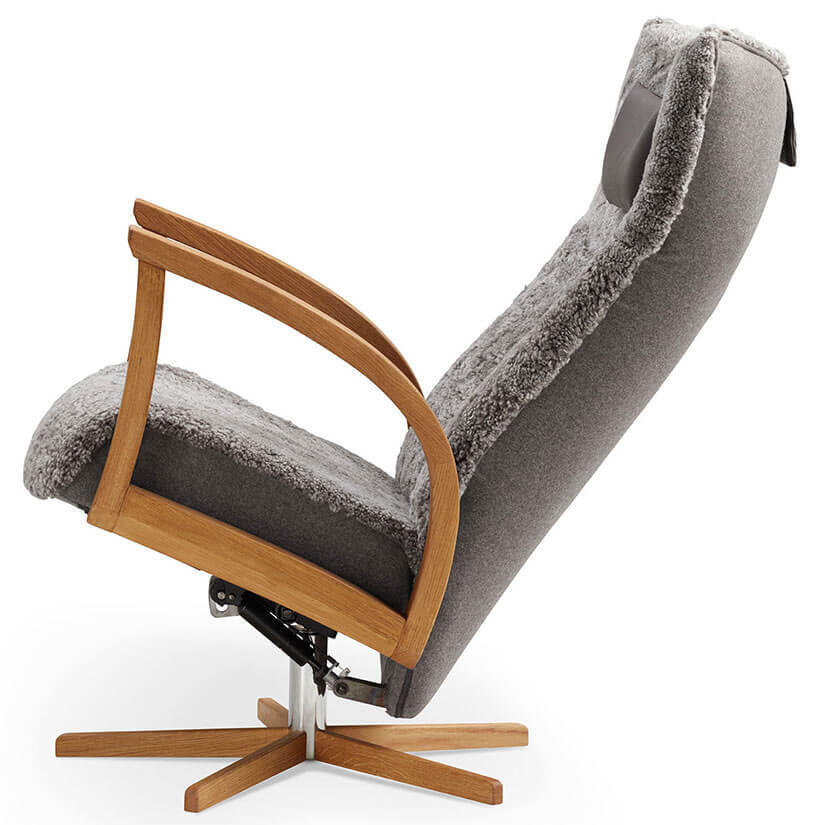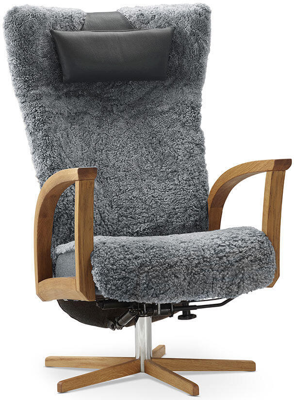 - Vid val av fårskinn Grey är bakryggen i tyg Facet färg 04 mörkgrå med en svart nackkudde i Classic läder.