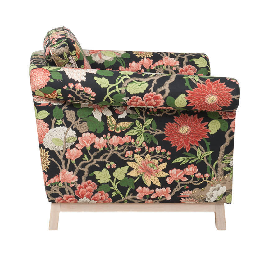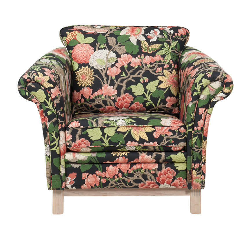 På produktbilderna visas fåtöljen i tyg Magnolia 09 Svart med bensockel i vitpigmenterad ek.