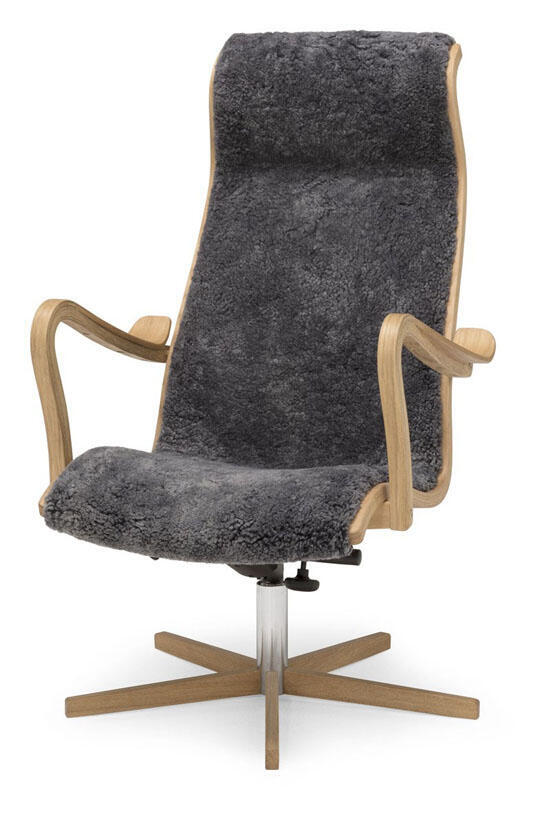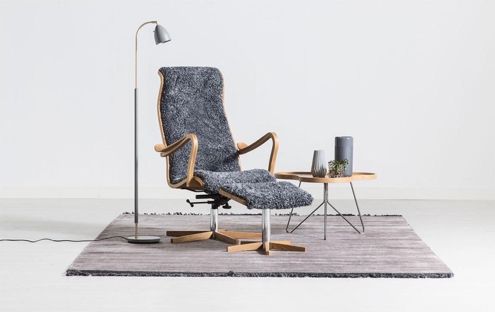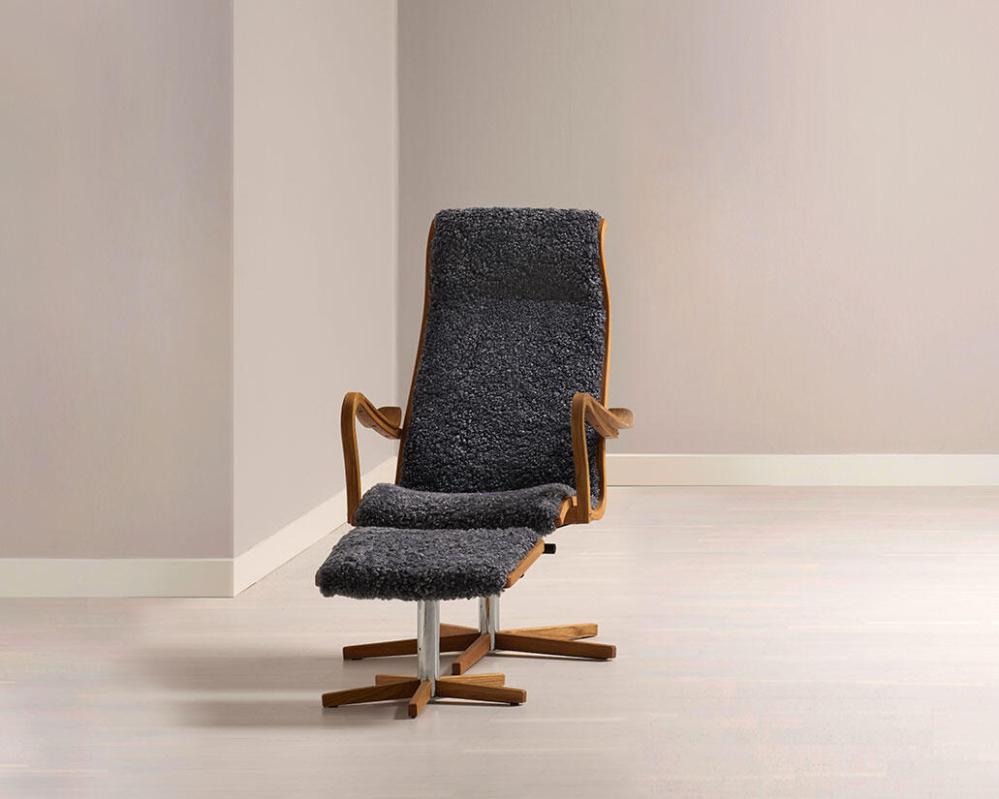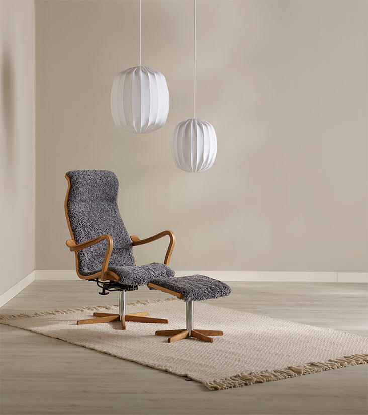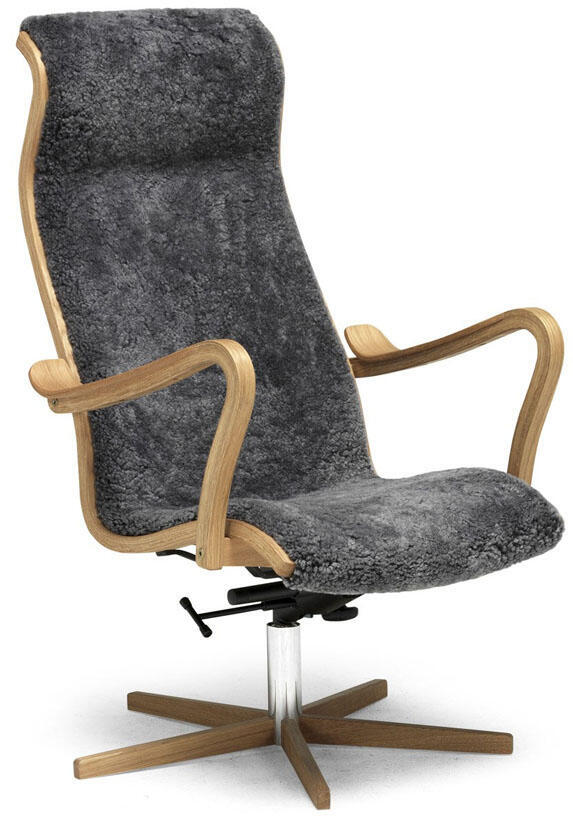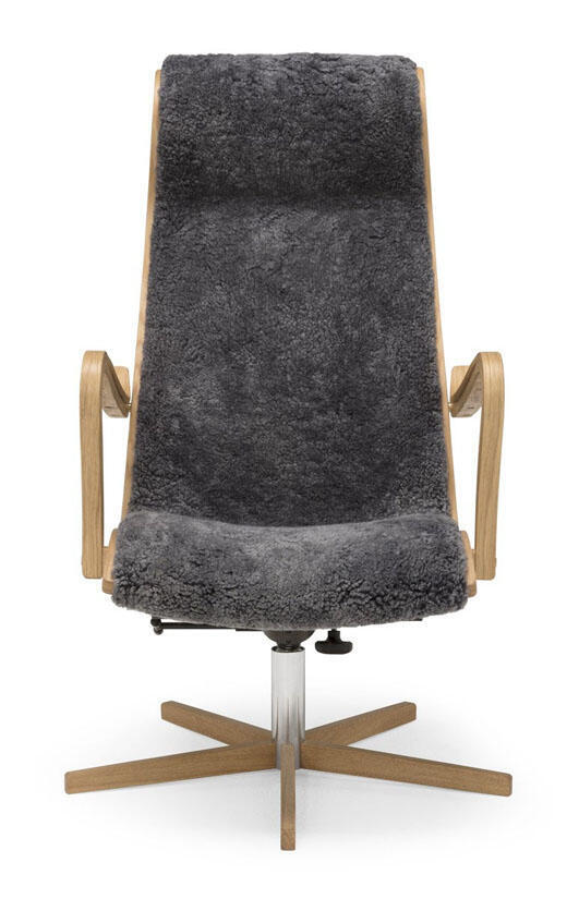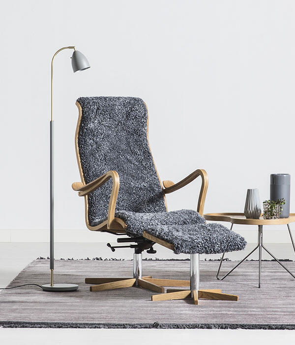 Greven - böjträstolen i tyg, läder eller fårskinn signerad G A Berg. Alltid lika rätt. Alltid lika omtyckt. Fåtöljen har snurrfot och gungfunktion med trädetaljer i ek. Köp till fotpall för extra hög komfort!