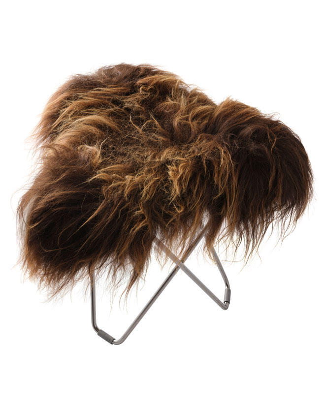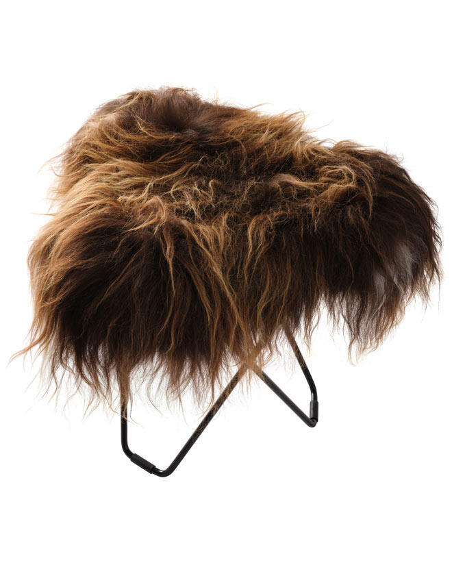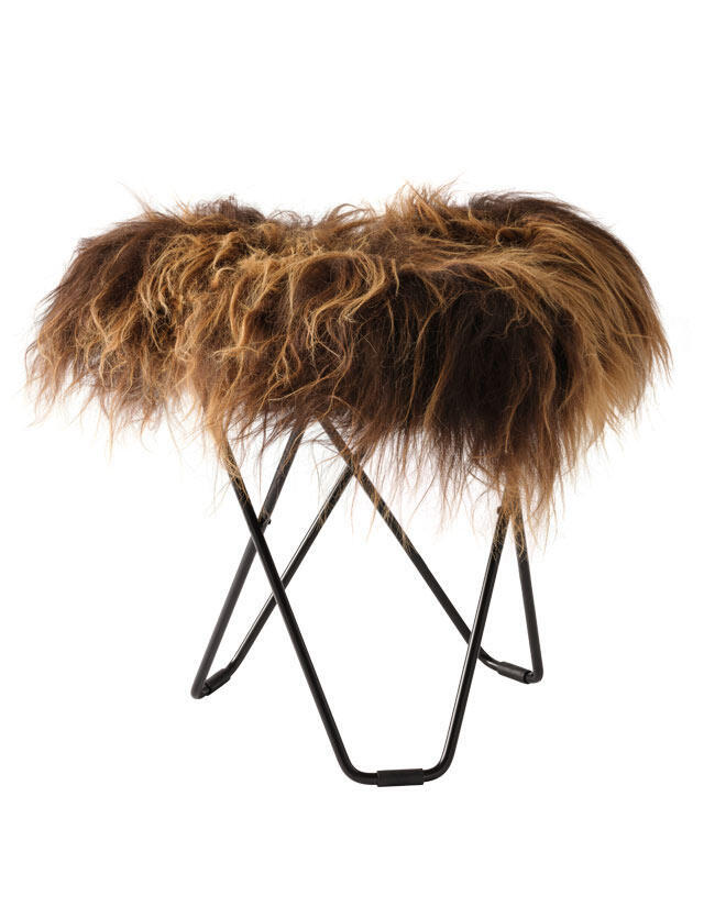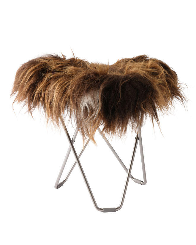 Iceland Flying Goose finns i flera fina färger av äkta naturfärgat isländskt lammskinn och även i tjockt italienskt läder, alla levereras med svartlackerat eller mattkromat solitt svenskt stål. Pallarna med en topp av läder hittar du en bit ner på sidan under liknande produkter med namnet "Pampa Flying Goose".