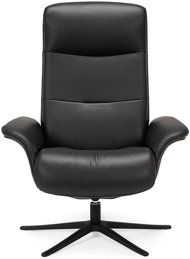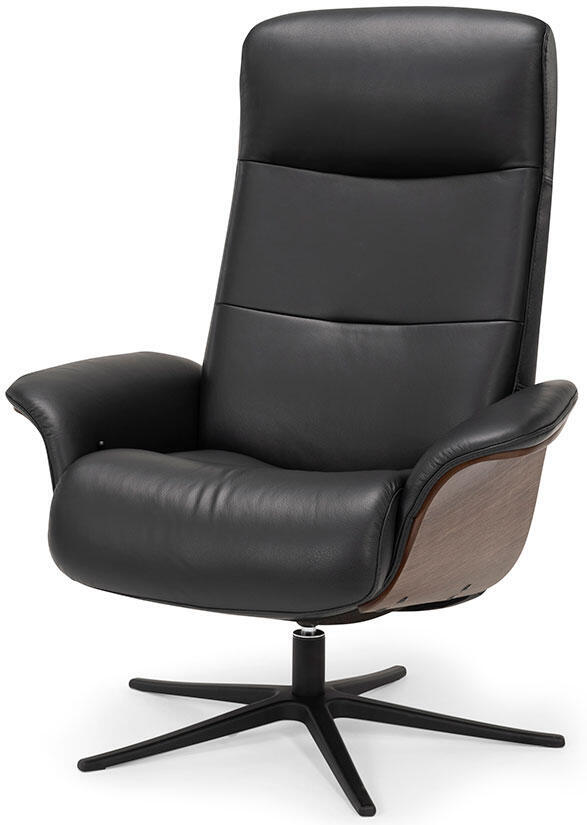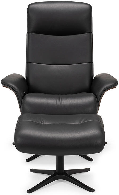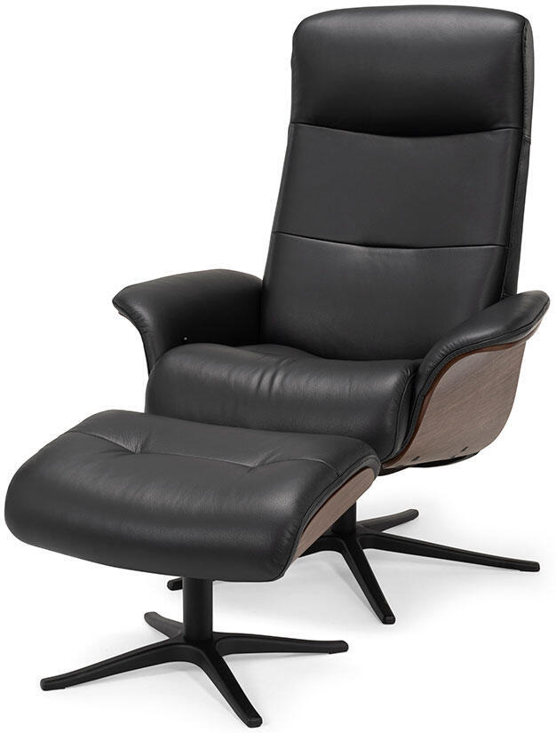 Denna modell är klädd i ett mjukt och bekvämt svart läder som dessutom är enkelt att sköta och rengöra. Fåtölj och fotpall har träsidor av valnöt. Underrede av svartlackad metall.