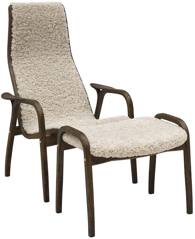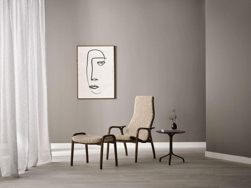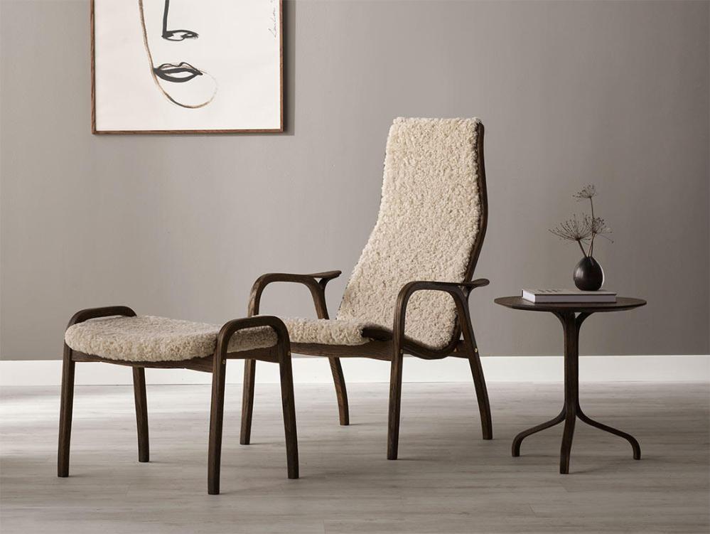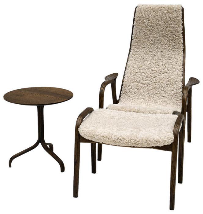Fåtölj, fotpall och sidobord här i Svenska Hem-exklusivt utförande, rökt oljad ek med valfri fårskinnsfärg, på bilderna visas fårskinn Moonlight, Espresso och Sahara.