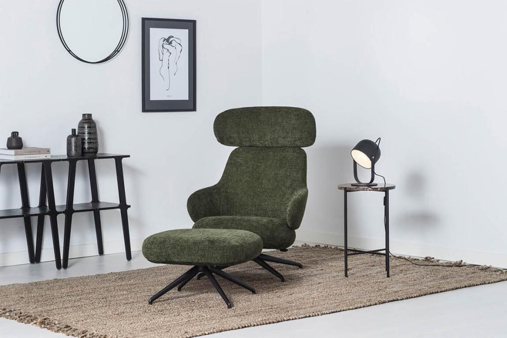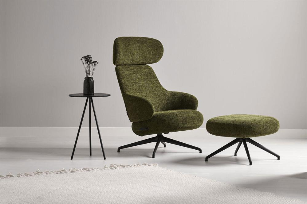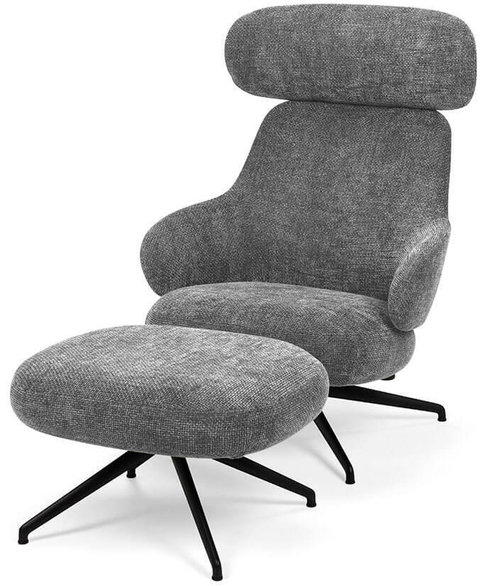 Fåtöljen och fotpallen Pillo är här klädd i möbeltextilen Lazy - ett grovt vävt högkvalitativt möbeltyg. Strukturen och den innovativa färgningsprocessen ger en fin karaktär och ett skönt liv i tyget. Välj bland tre fina färger. På produktbilderna visas respektive färg med svartlackerad fot.