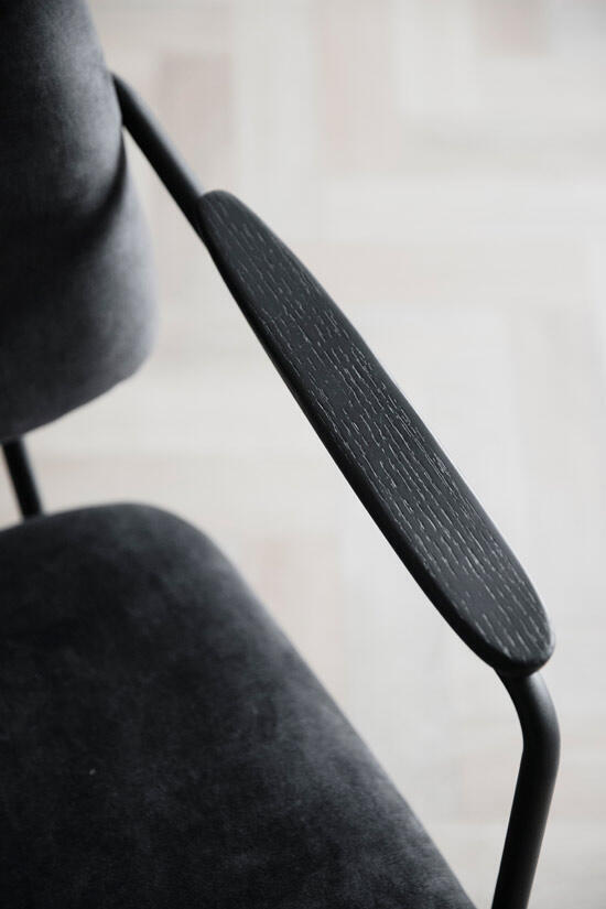 Stoppad sits och rygg, klädd med lyxig sammet. Stomme i pulverlackad metall i sandstruktur, och armstöd i massiv ek m...