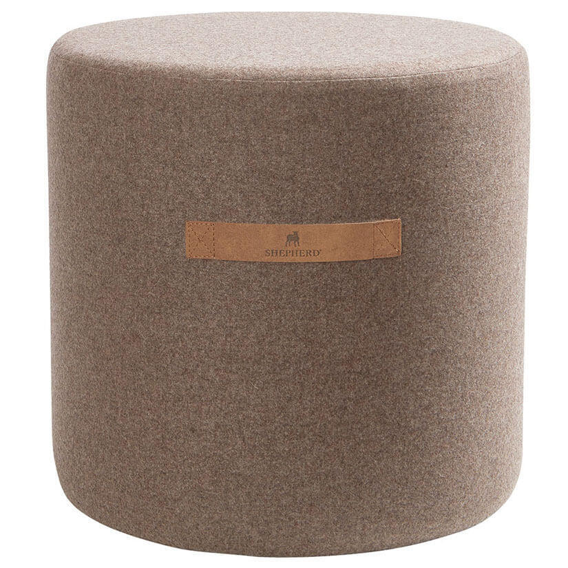 Shepherd Sara. En rund sittpuff i vävd mjuk ull. Sittpuffen är uppbyggd utav en fast del i botten som gör att puffen håller sin form och ovandel i skumgummi för bästa komfort. Den har ett dekorativt handtag i läderimitation. Puffens klädsel är avtagbar och tvättbar med dragsko i botten. Undersida i vävd textil.
