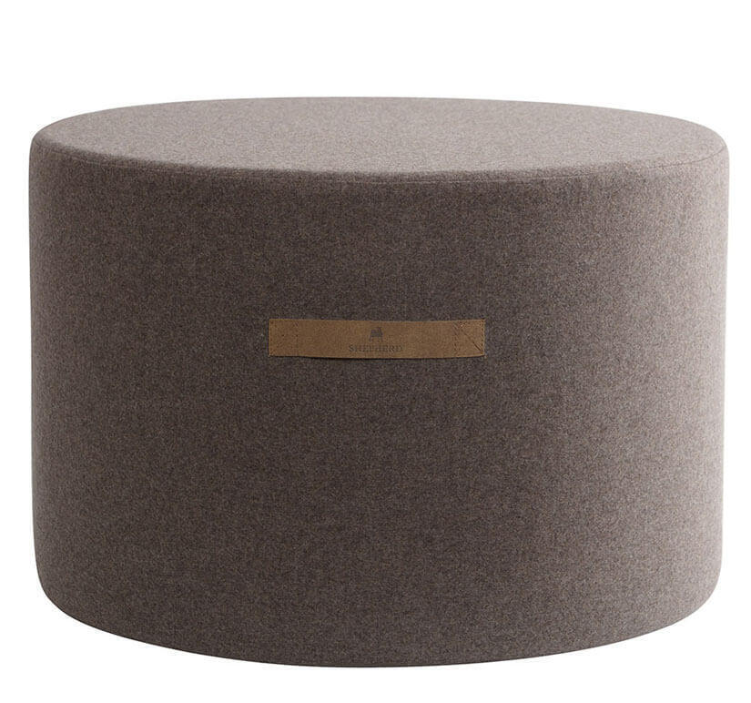 Shepherd Sara. En rund sittpuff i vävd mjuk ull. Sittpuffen är uppbyggd utav en fast del i botten som gör att puffen håller sin form och ovandel i skumgummi för bästa komfort. Den har ett dekorativt handtag i läderimitation. Puffens klädsel är avtagbar och tvättbar med dragsko i botten. Undersida i vävd textil.