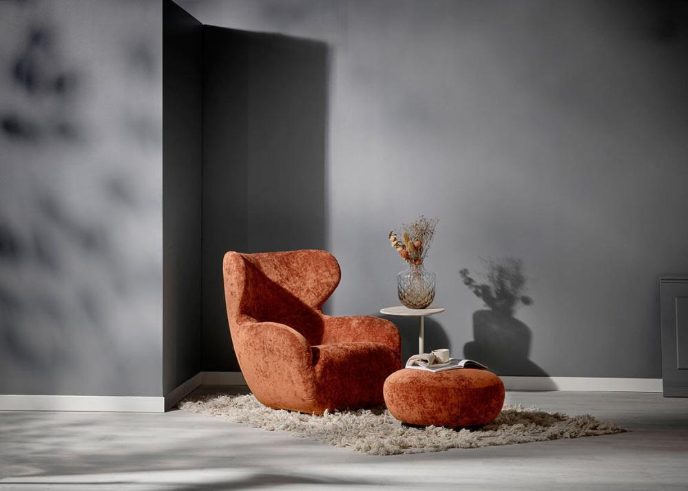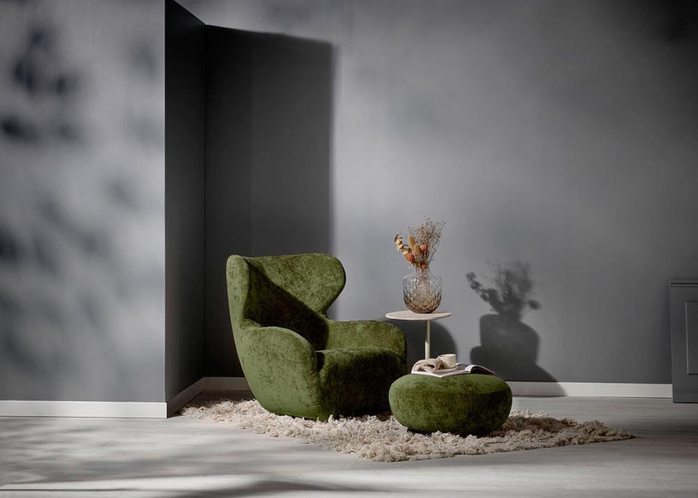 Shell fåtölj och fotpall är formgiven av Ian Archer. Snurrfåtöljen är en dröm för design- och komfortälskare. Shell har en design likt öronlappsfåtöljer med böjda armstöd och rygg med ett omslutande nackstöd.
