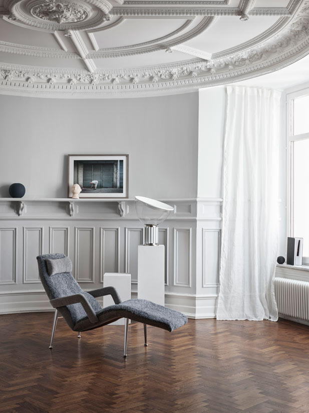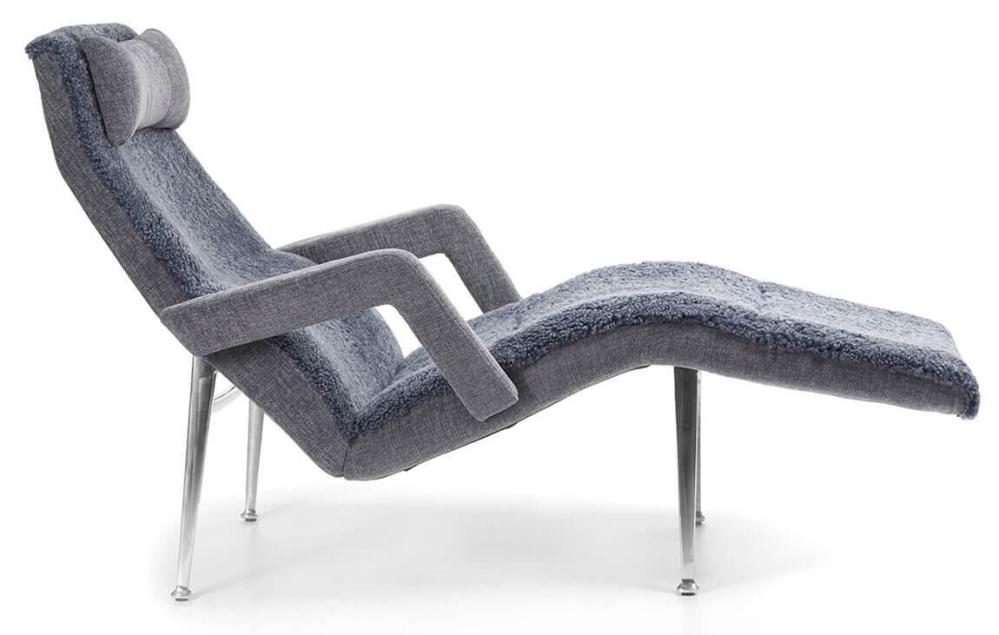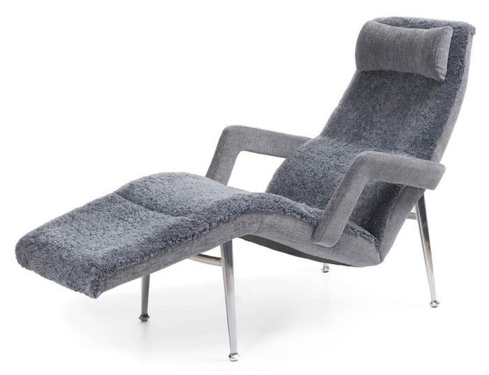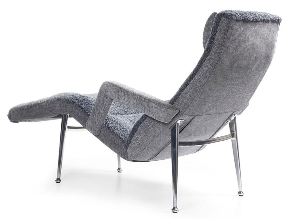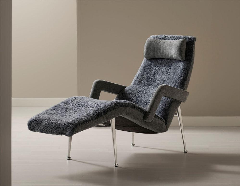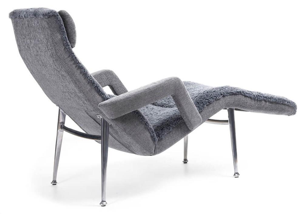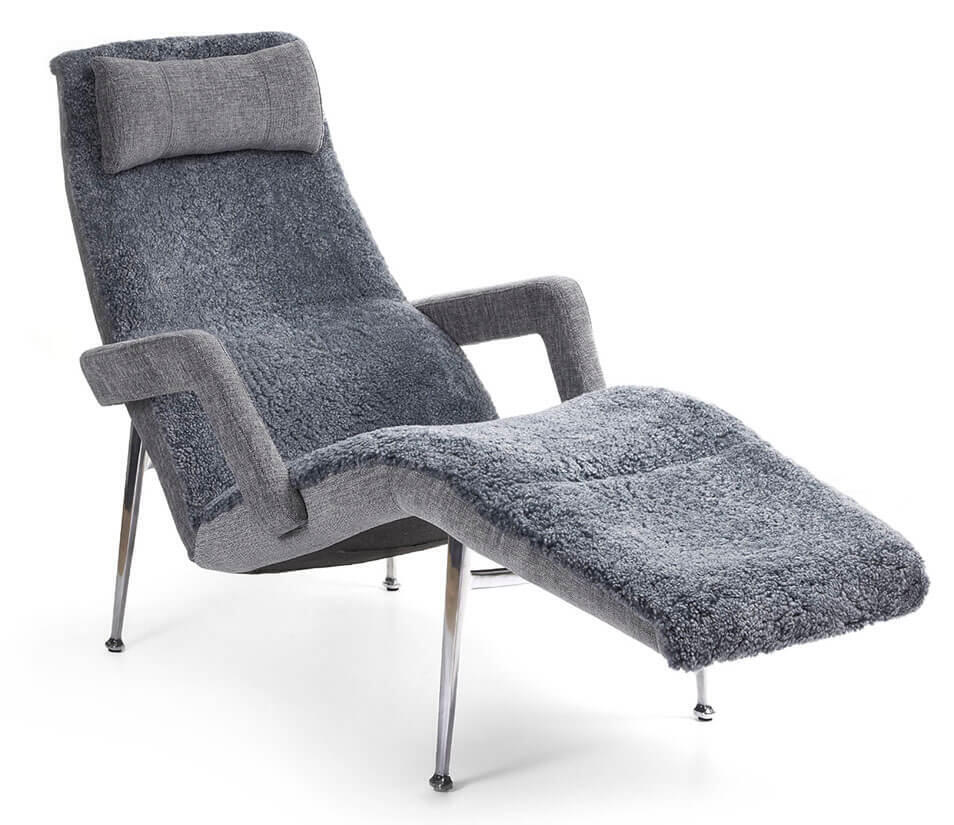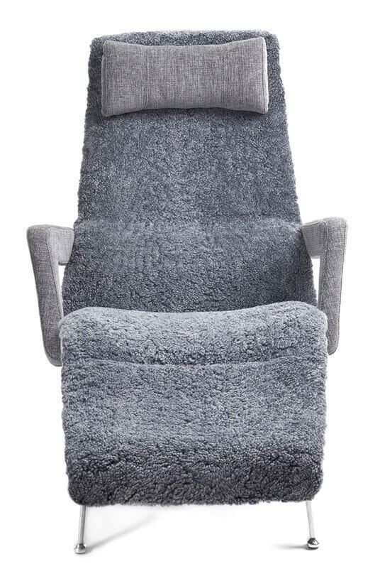 På produktbilderna visas liggfåtöljen Starlight med aluminiumfot och fårskinn Graphite. Fårskinnet matchas med passande tyg på nackkudde, armstöd och fåtöljens baksida. Mer information om fårskinnsklädsel hittar du som nedladdningsbart produktblad.