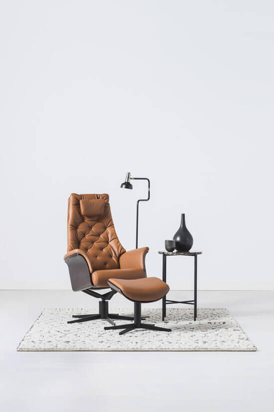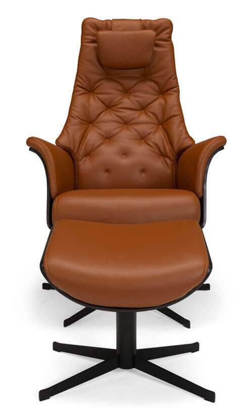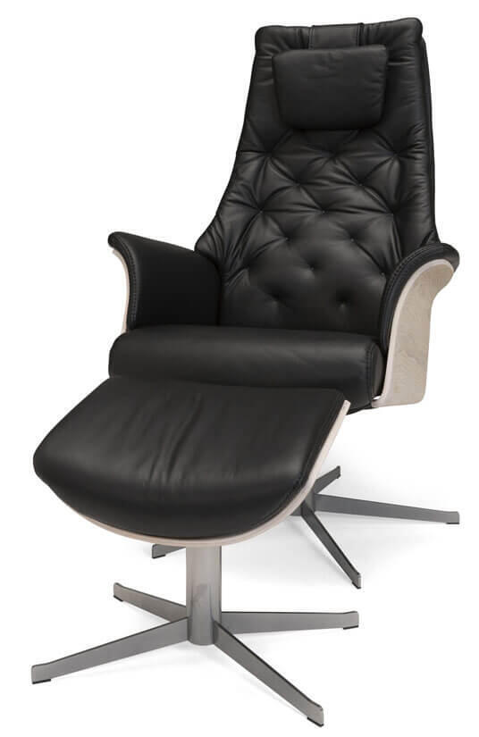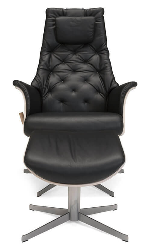 Fåtölj Vellino med tidlöst uttryck på ett modernt sätt. Härlig komfort med steglös lutning för en skön upplevelse. Nackvinkel justeras manuellt. Pris inklusive fotpall. Fot har ej återsnurr.