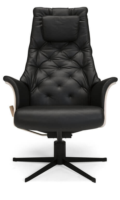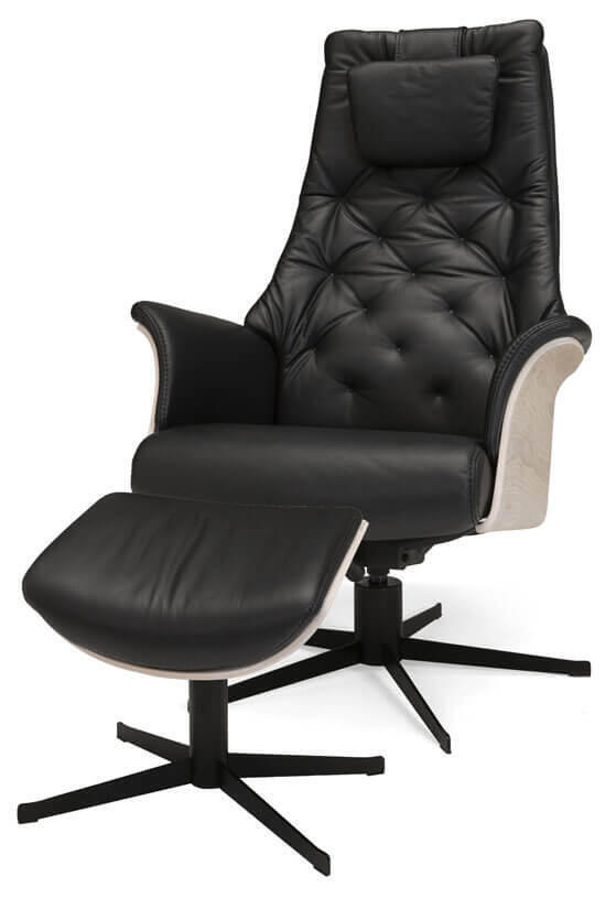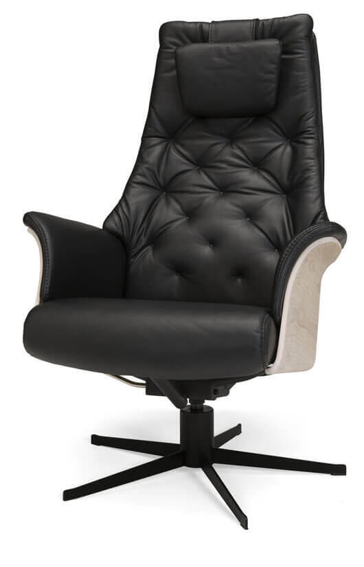 Fåtölj Vellino Maxi med tidlöst uttryck på ett modernt sätt. Härlig komfort med steglös lutning för en skön upplevelse. Nackvinkel justeras manuellt. Pris inklusive fotpall. Fot har ej återsnurr.