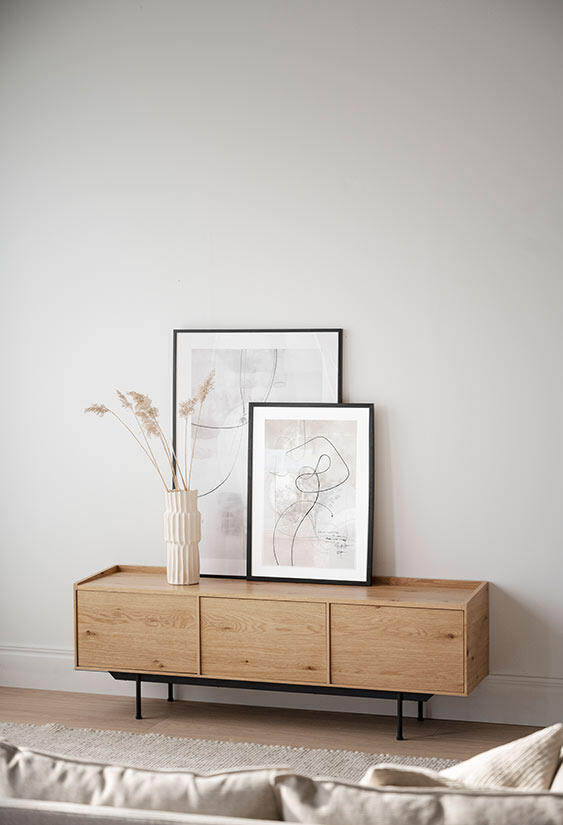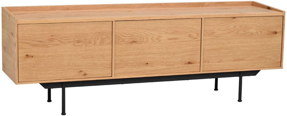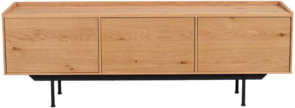 Alla skåpsluckorna öppnas med hjälp av push-open och hela fronten kommer från samma planka i trädet vilket ger ett stilrent helhetsintryck. De tre flyttbara hyllplanen ger flexibilitet och perfekta förvaringsmöjligheter. Den mångsidiga mediabänken har hål för sladdar på baksidan och möbeln kan även användas som ett lågt sideboard. Svarta ben i pulverlackad metall med sandstruktur.