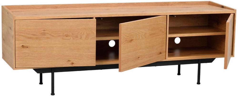 Praktiska Brewerton tv-bänk i lackad vildek med synliga kvistar och märken, vilket är en del av tv-bänkens karaktär och stärker träkänslan i möbeln.