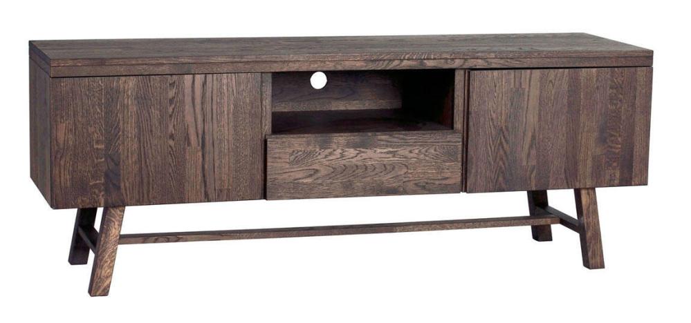 TV-bänk Brooklyn i fingerskarvad mörkbrun massiv ek. Praktiskt uttag för sladdar på baksidan och med mjukstängning på låda och dörrar.