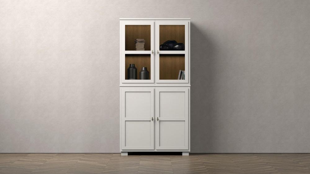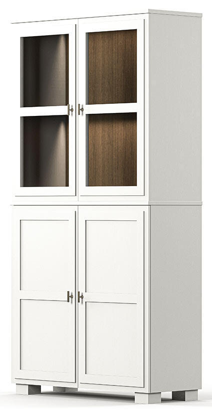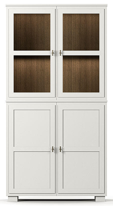 Skåpet är uppdelat i två delar, ett underskåp och ett överskåp. Den stabila basen består av en skänk med två trädörrar. Bakom varje dörr döljs en hylla och låda för smart förvaring. Ovanpå är ett överskåp med glasdörrar som har samma innehåll förutom lådor. Tillsammans ger utrymmena dig möjlighet att anpassa förvaringen på ett bra sätt.