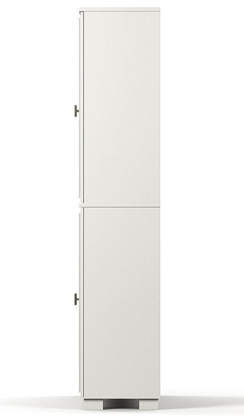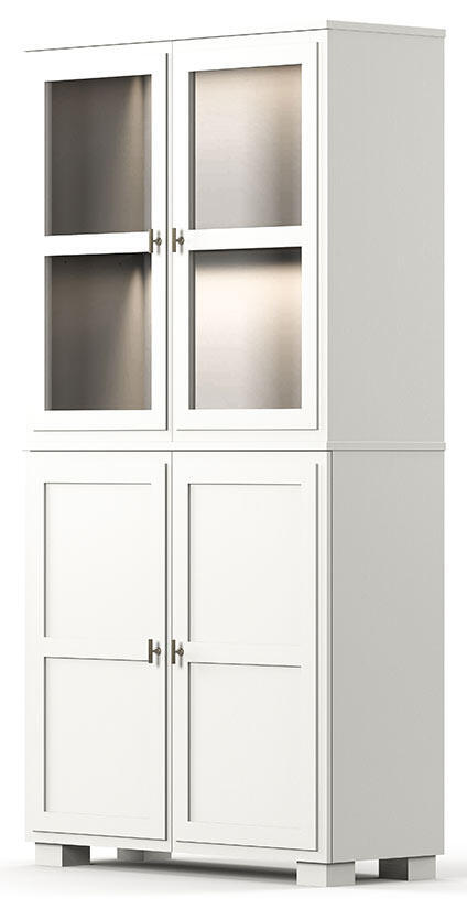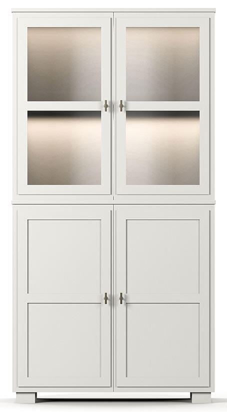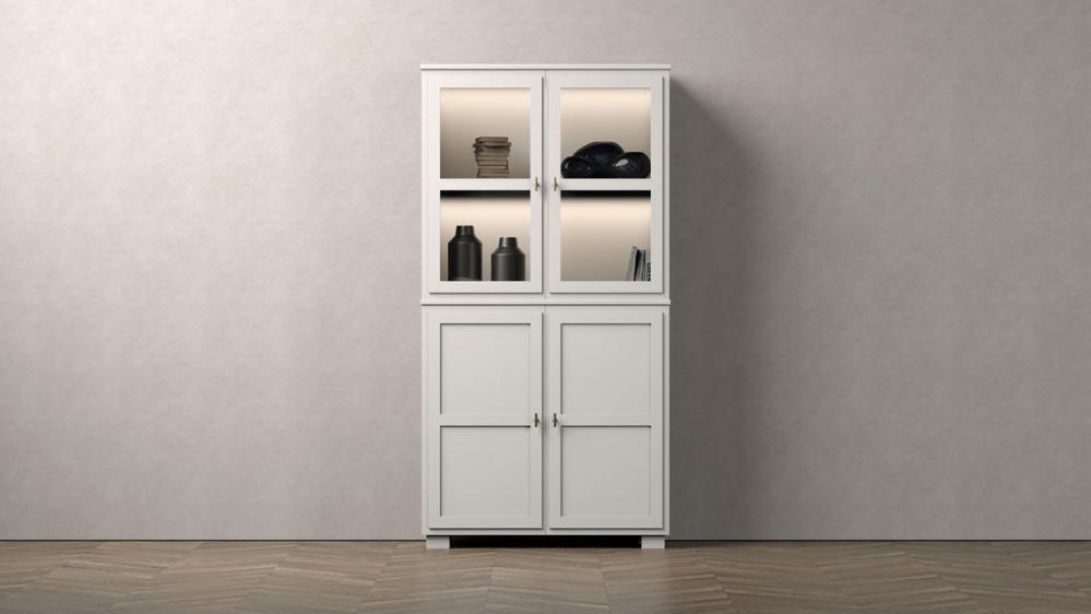 Skåpet är uppdelat i två delar, ett underskåp och ett överskåp. Den stabila basen består av en skänk med två trädörrar. Bakom varje dörr döljs en hylla och låda för smart förvaring. Ovanpå är ett överskåp med glasdörrar som har samma innehåll förutom lådor. Tillsammans ger utrymmena dig möjlighet att anpassa förvaringen på ett bra sätt.