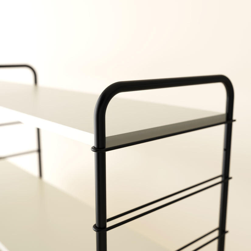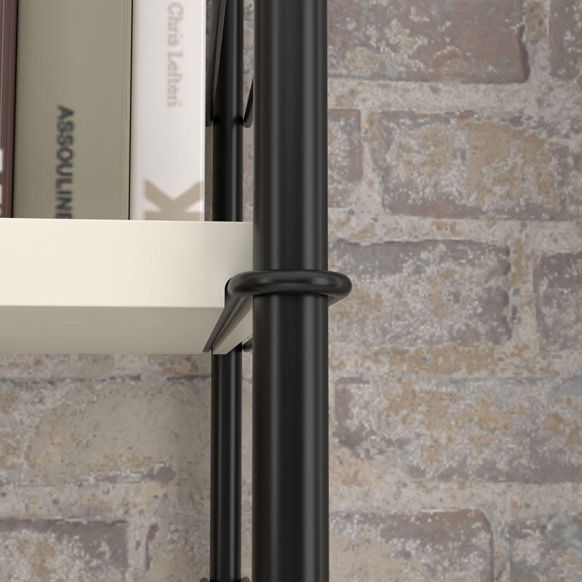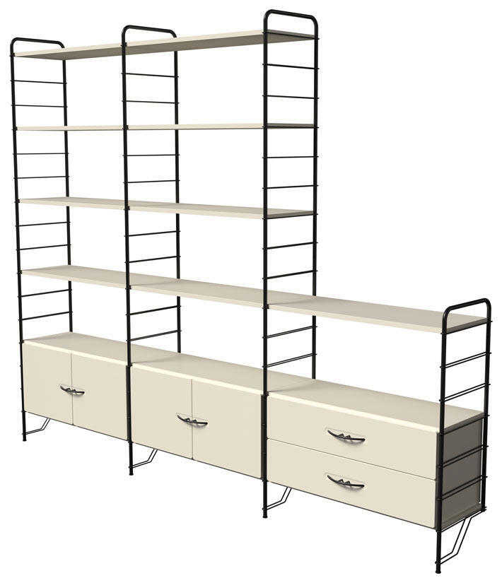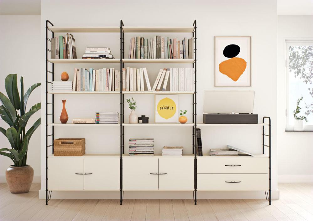 Hyllan är enkel att montera. Hyllplan, dörrar, lådor och arbetsskiva är lätta att monterat på golvgavlarna. Det är lätt att komplettera med dörrinsatser och/eller lådor i efterhand. Eller flytta modulerna allt eftersom och ändra hyllans utseende och funktionalitet. Alla moduler har rundade kanter, dörrar och lådor har en vacker urfräsning runt de svarta metallhandtagen, levereras med mjukstängande beslag.