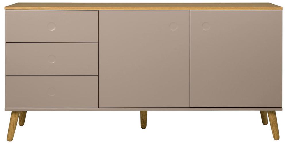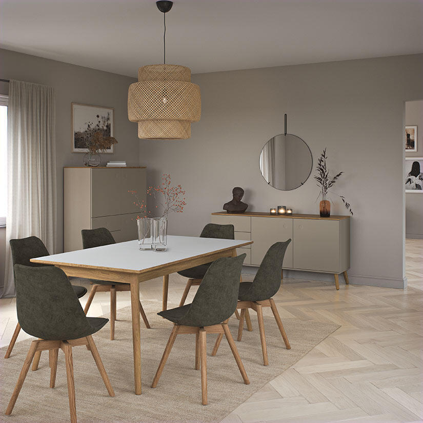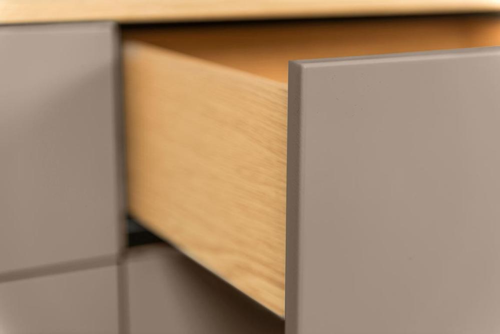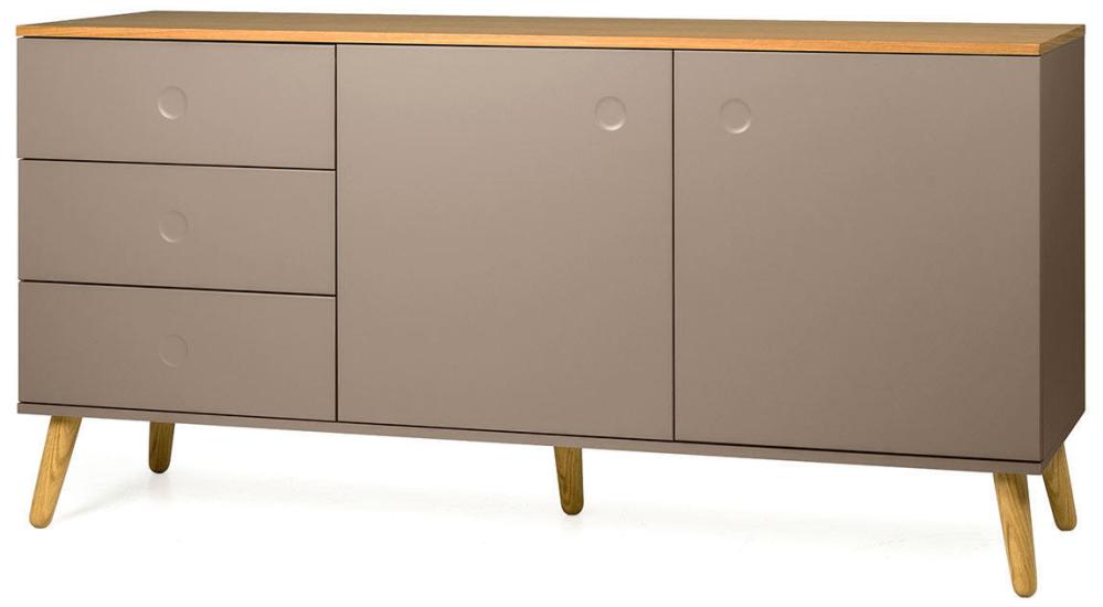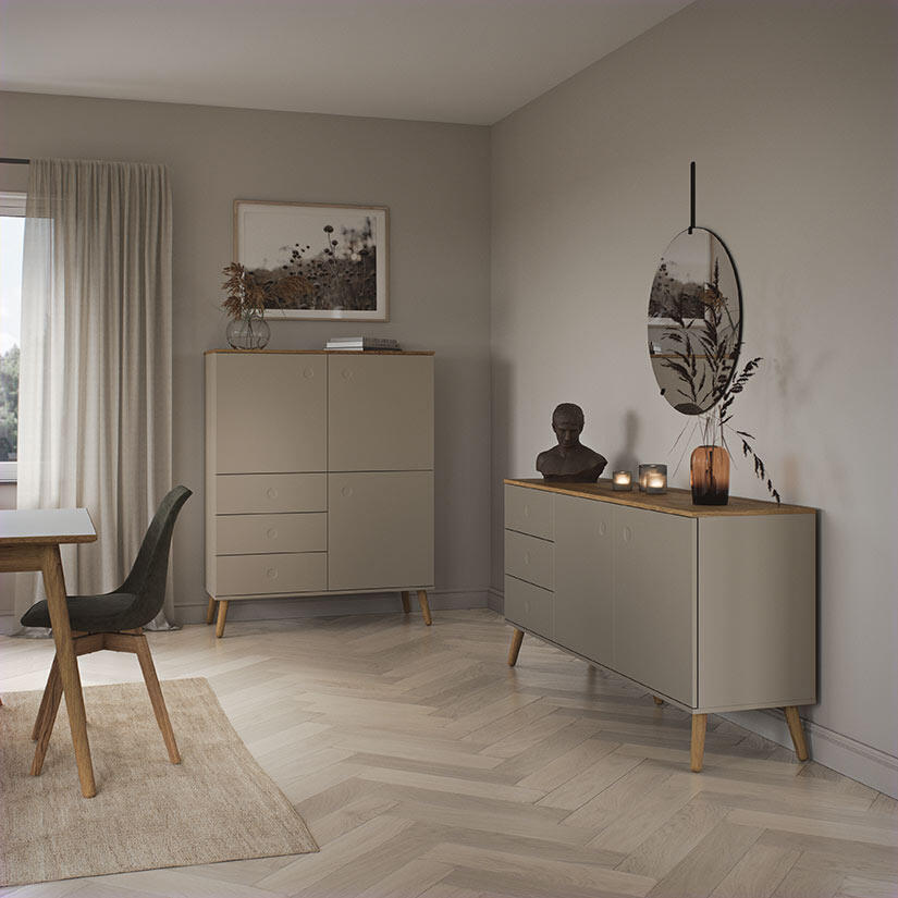 Dot sideboard med ektopp och ekben har en snygg design i kombination med bra förvaring, bättre blir det inte! I skåpsdörrarna och lådorna finns inga handtag/knoppar utan de öppnas med hjälp av sin smarta push-up-funktion. Finns i fyra färger: Grå, Vit, Taupe och Salvia.