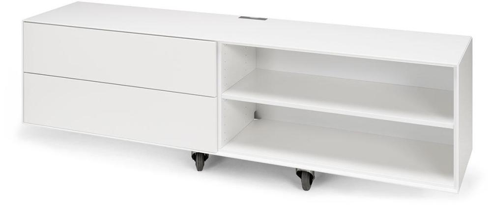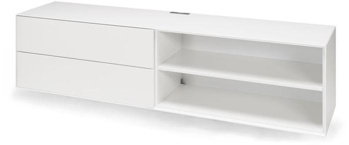 Edge kombination 1 är en nätt och stilren mediabänk som enkelt hängs direkt på väggen alternativt placeras på golvet med tillvalet rullhjul (höjden ökas då med 12,5 cm). TV-bänken på 180 cm är helt lackad i vattenbaserad och miljövänlig vitlack. För att göra möbeln bättre anpassad som medialösning under din TV har topp- och bottenskivan hål för grenuttag, inklusive ett stilrent lock.
