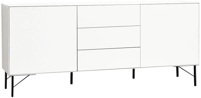 Denna modell är helt lackad i vit miljövänlig lack med svarta 20 cm höga metallben. En förvaringsmöbel som ger mycket god förvaring tack vare de rymliga skåpen med ett varsitt justerbart hyllplan och de tre lådorna med fullutdrag.