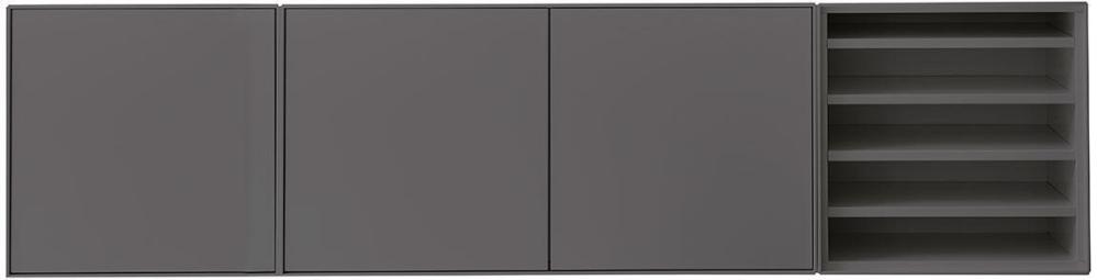 Edge kombination 5 är en vägghängd hylla på 181 cm, med tre dörrar och en sektion med fyra flyttbara hyllplan. Du väljer själv på vilken sida av stommen som du önskar placera dörrarna och hyllsektionen. Vägghyllan är helt lackad i vattenbaserad och miljövänlig antracitfärgad lack.