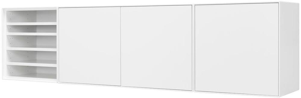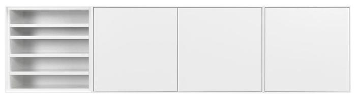 Edge kombination 5 är en vägghängd hylla på 181 cm, med tre dörrar och en sektion med fyra flyttbara hyllplan. Du väljer själv på vilken sida av stommen som du önskar placera dörrarna och hyllsektionen. Vägghyllan är helt lackad i vattenbaserad och miljövänlig vitlack.