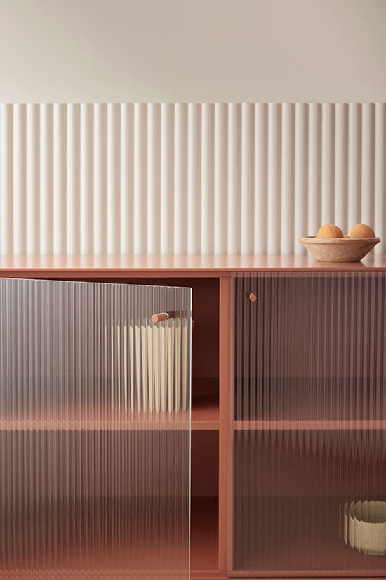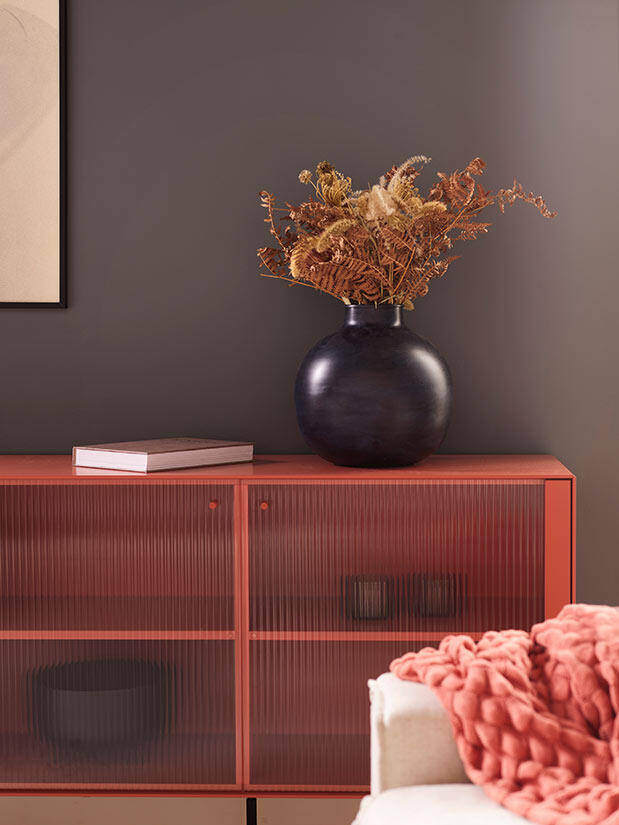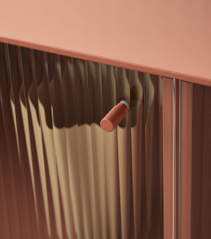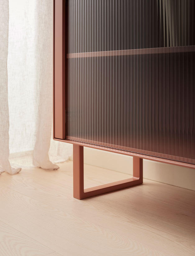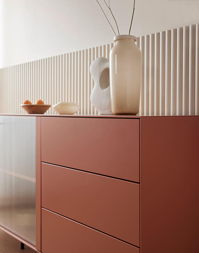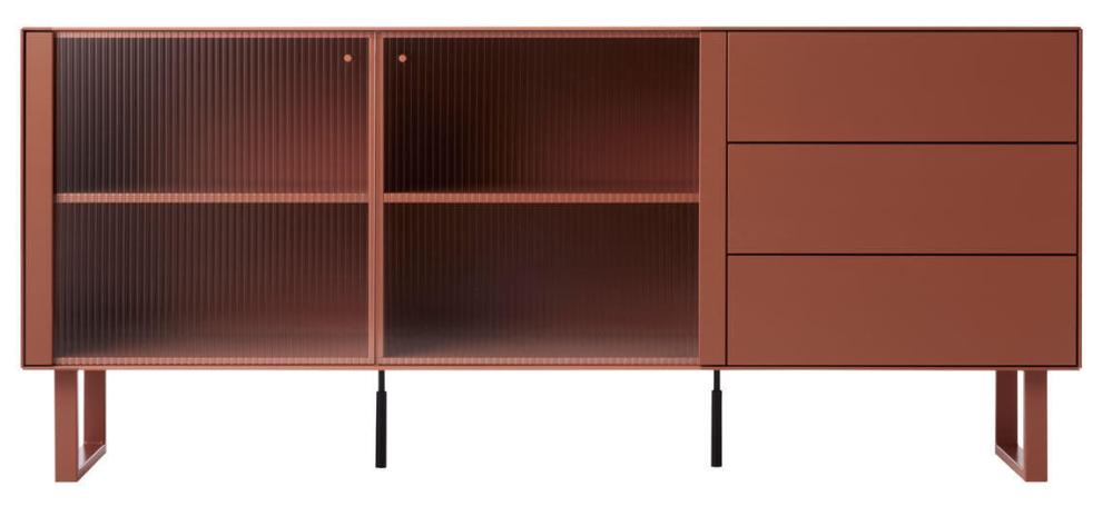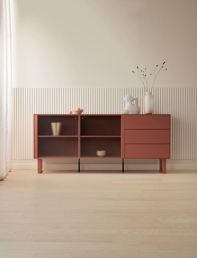 Edge kombination 8 bildar ett elegant sideboard med en stomme på 180 cm tillsammans med tre lådor och två vitrindörrar (en vänster- och en högerhängd). Du väljer själv på vilken sida av stommen som du önskar placera lådorna och vitrindörrarna. Lägg gärna märke till de räfflade glasdörrarna och metallknopparna i metall som går i ton i ton med lackfärgen.
