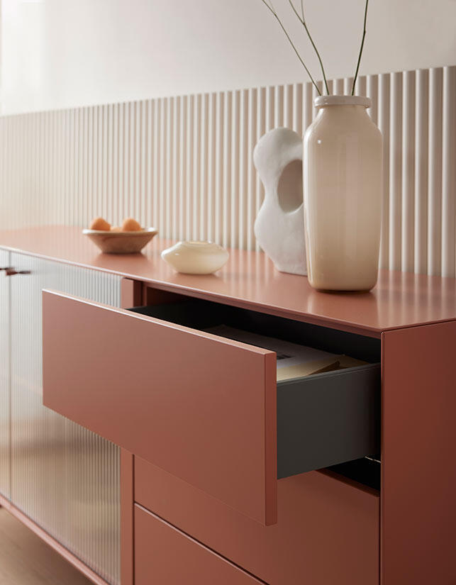Modulerna levereras monterade men du själv väljer var luckor och lådor ska placeras. Serien har justerbara hyllplan med möjlighet att komplettera med fler. Lådor har pushfunktion och fullutdrag för god förvaring.