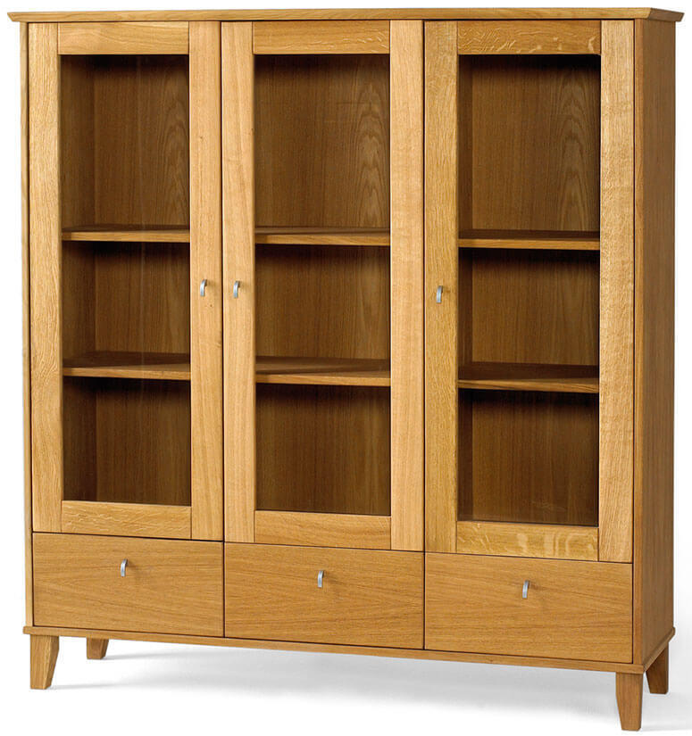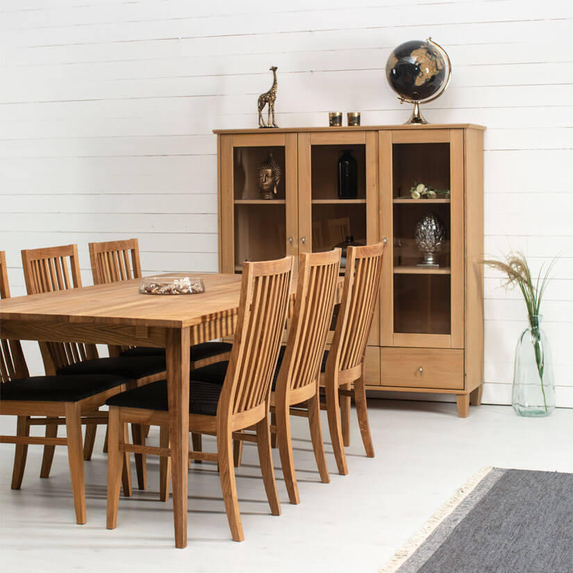 Ekliden vitrinskåp i klassisk design från svenska Torkelson är tillverkad av fanérad och massiv ek som sedan behandlats med naturell olja för att få den fina och tåliga ytan. Det praktiska förvaringsskåpet med tre glasdörrar och tre lådor ger god förvaring för både saker som man vill dölja och visa upp i hemmet. Varje dörrsektion har två justerbara hyllplan som låter dig anpassa möbeln efter dina behov.