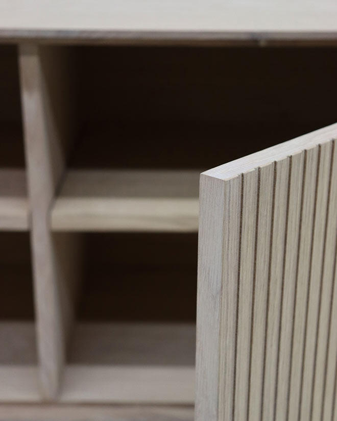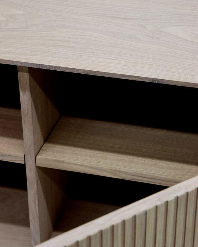 Vår egendesignade förvaringsserie Elma är av god kvalitet där de rena raka linjerna i kombination med tunna material skapar en tidlös look. Elma är tillverkad av ekfanér på spånskiva med massiva kantlister och finns i färgerna vitolja och brunolja. Ovandelen kombineras stilrent med det svarta stålstativet med justerbara fötter för eventuell anpassning till ojämnt underlag.
