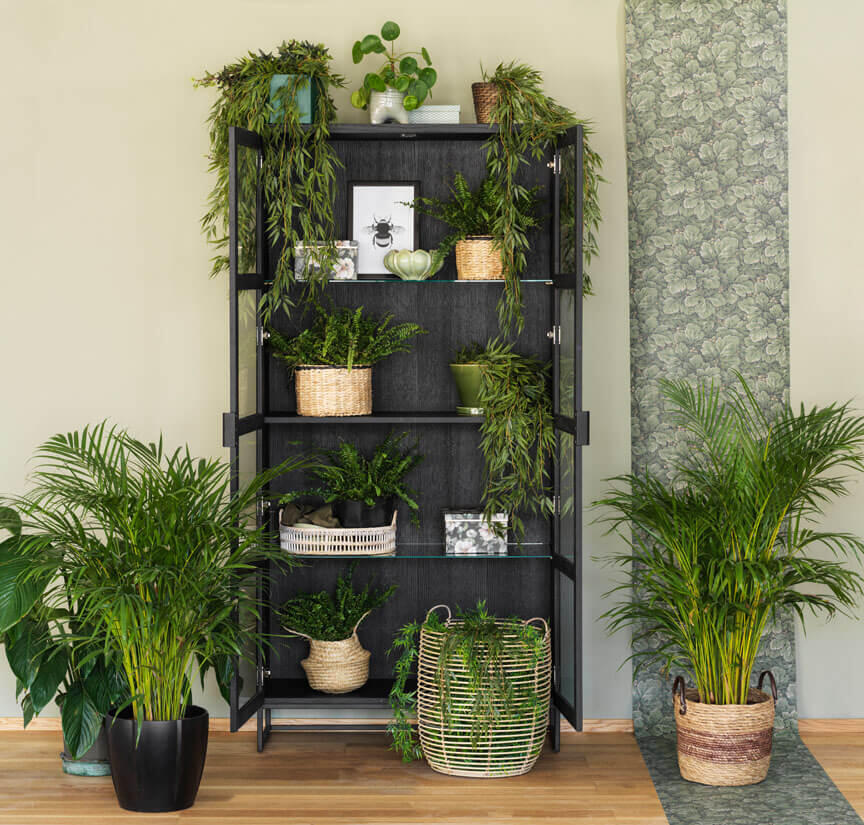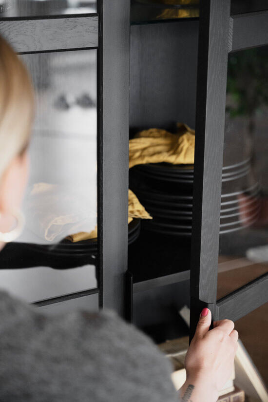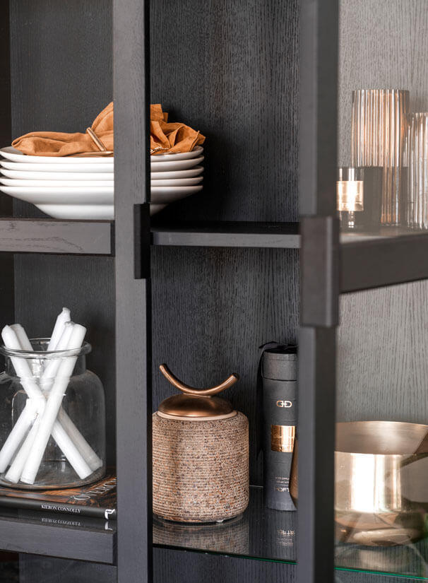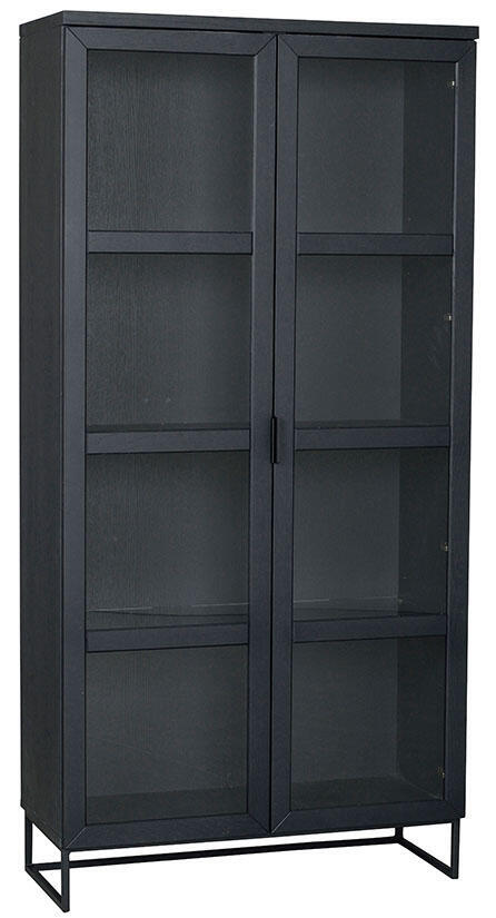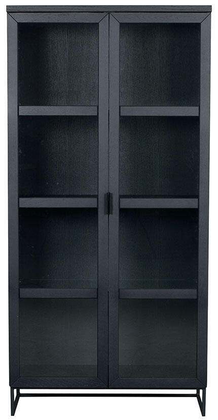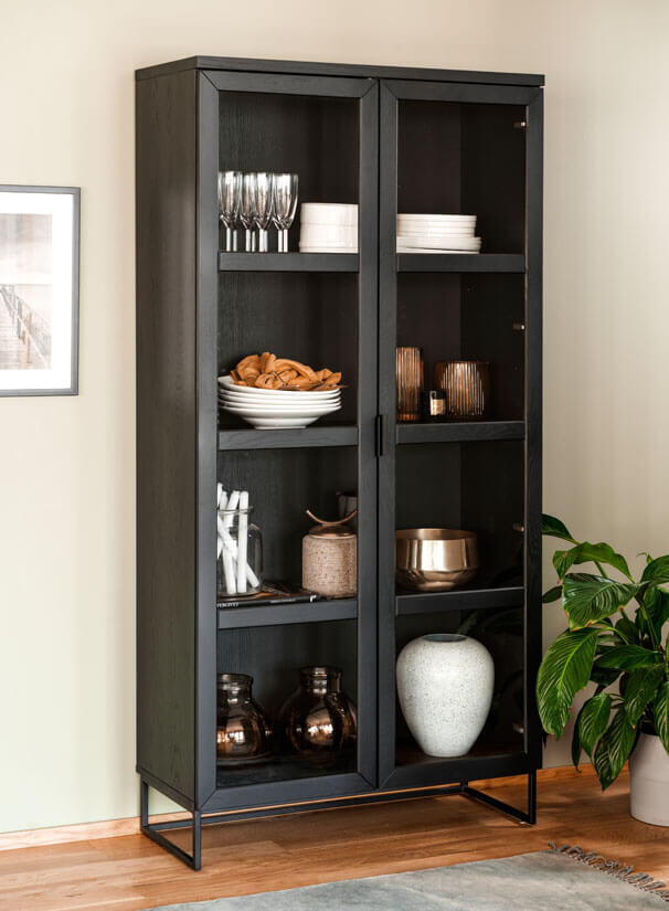 Everett vitrinskåp med glasdörrar. Skåpet är i massiv svartlackad ek och har en slät yta. Flyttbara glashyllor samt svarta ben i pulverlackad metall. Innanför dörrarna sitter tre hyllplan, varav två är flyttbara och dörrarna har mjukstängande soft-close funktion.