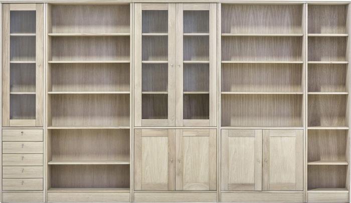 - G9 är en bred bokhylla med trädörrar. Ovandel med ett fast och två flyttbara hyllplan och en underdel med ett dörrpar som har en justerbara hylla bakom.