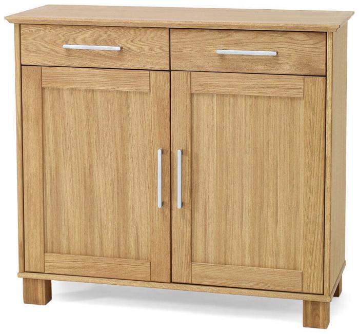 Hovdala är en klassisk skänk tillverkad av naturoljad massiv och fanérad ek som levereras färdigmonterad direkt från fabriken. Den rymliga förvaringsmöbeln har två praktiska lådor med två dörrar nedtill där varje skåp har ett varsitt justerbart hyllplan. Dörrar såväl som lådor har stilrena handtag av aluminium som ger Hovdala sin karaktäristiska design. Skänken finns även i en större storlek med fyra lådor och tre dörrar dörrar samt som vitrinskåp med matchande ovandel med glasdörrar, de hittas en bit ner på sidan under Liknande produkter.