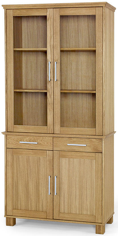 Vitrinskåpet Hovdala tillverkad av naturoljad massiv och fanérad ek är ett klassiskt skåp som ger dig god förvaring. Det rymliga och praktiska skåpet har ett dörrpar av glas med två justerbara hyllplan och nedtill två mindre dörrar av trä med ett justerbart hyllplan bakom vardera dörr. I mitten av skåpet finns två lådor. Dörrar såväl som lådor har stilrena handtag av aluminium som ger Hovdala sin karaktäristiska design. Vitrinskåpet levereras i två färdigmonterade delar, finns även i en större storlek samt säljs underdelen även som separat produkt.
